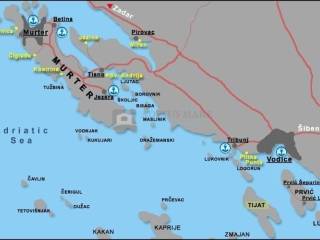 Zemljište je pravokutnog oblika, proteže se sredinom otoka s dvije obale dužine 31 m, udaljenost od jedne do druge obale je 230 m. Istočna obala s pogledom na Tribunj-Vodice-Šibenik je stjenovita (pogodna za privez broda), a zapadna obala s pogledom na Murter-Tisno-Pirovac je šljunčana (pogodna za kupanje).