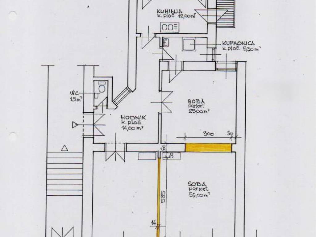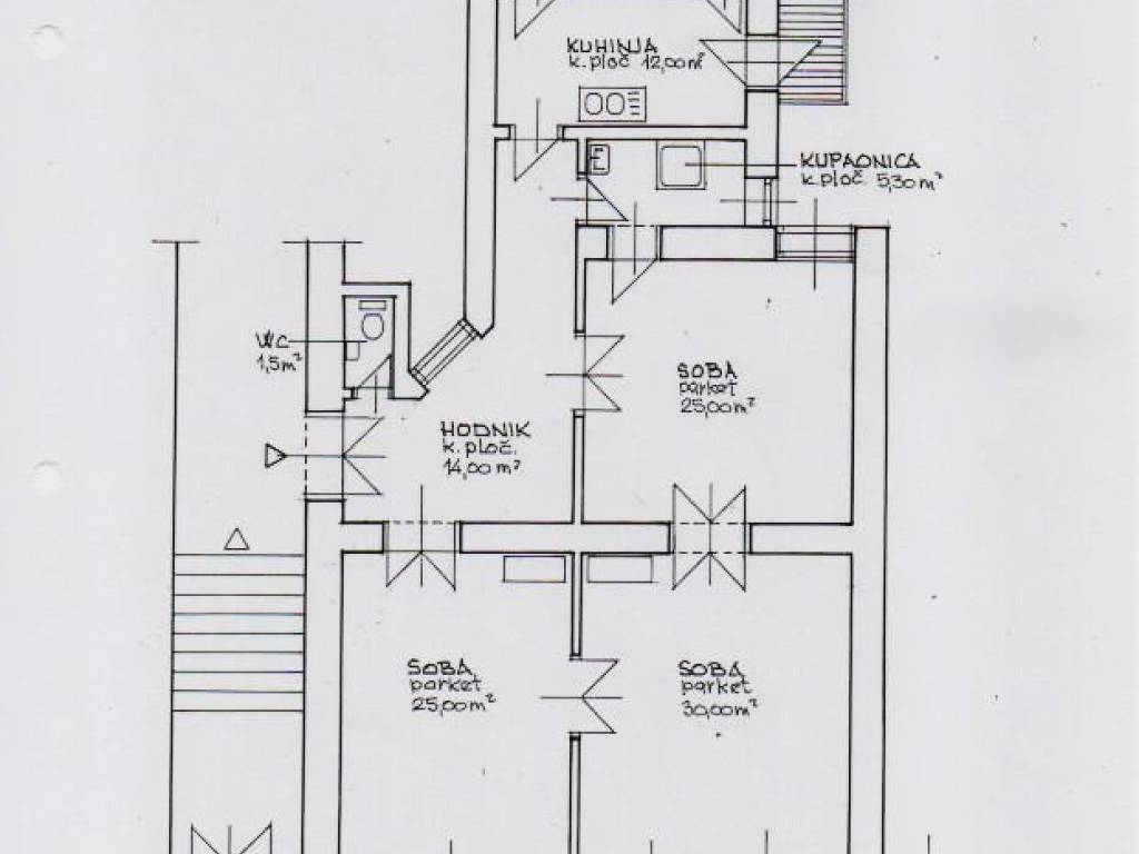 Stan se inicijalno sastojao od tri prostrane sobe i jedne manje sobe (djevojačke) te dalje, kupaonice, zasebnog toaleta, balkona te pripadajućeg spremišta. Trenutačno su tri prostrane sobe spojene u jednu (vidljivo na tlocrtu) što novom vlasniku omogućuje različite intervencije u prostoru te krojenje rasporeda prema vlastitim željama.