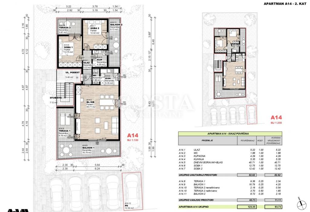 A two-bedroom apartment under construction is for sale in Povljana on the island of Pag. The apartment with a living area of 82.62 m2 is located on the second floor of a small residential building with 5 units. It consists of a living room, kitchen and dining room, two bedrooms, bathroom, additional toilet and a balcony and covered and uncovered terraces of an additional total of 40.73 m2. The apartment also has one private parking space in the courtyard of the building. The total usable area of the apartment together with the annexes is 123.35 m2 (K.V. 93.73 m2).