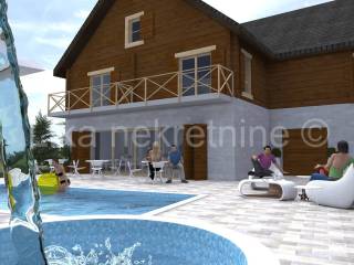 Za OBITELJSKU KUĆU, Pr+1 bruto površine 398 m2 u prizemlju: ulazni prostor, predvorje, 2 wc-a, kuhinju, dnevni boravak i blagovaonicu te kamin sobu, a na katu: stepenice, hodnik, 4 sobe sa kupaonicama, studio za goste...