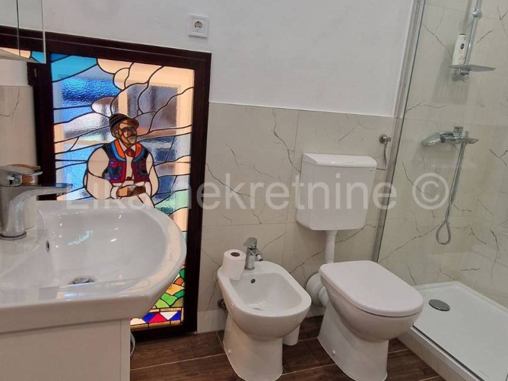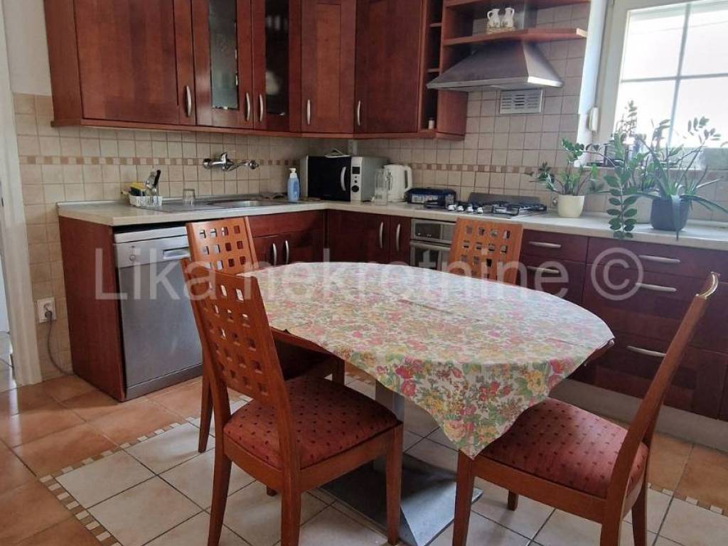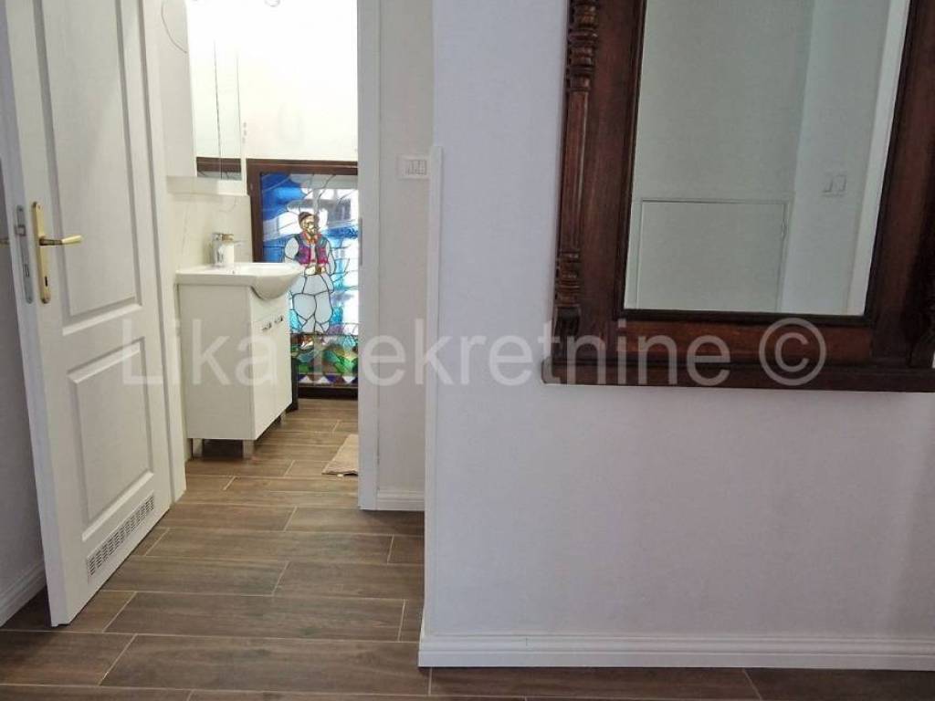 Sastoji se od predsoblja, boravka, dvije veće sobe, balkona, kupaonice sa tušem i toaletom, namještene i opremljene kuhinje(suđerica također), špajze, još jedne manje spavaće sobe i još jedne kupaonice sa kadom.