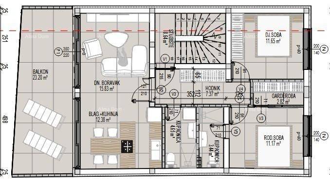 New in offer!Discover the perfect combination of modern design and comfort in a new building, in Tar.Apartment 3 with an area of ​​147.66 m² provides an ideal living space. The apartment is located on the second and third floors of a three-story building, and consists of a hallway, 2 bedrooms, a wardrobe, 2 bathrooms, a living room with a kitchen and a dining room and a large balcony of 23.20 m2 (16.83 m2) on the second floor and a closed roof space of 45.82 m2, an uncovered roof terrace of 50.81 m2 (12.70 m2) on the third floor.apartment characteristics:- The entrance door to the apartment is aluminum with a code entry- There is underfloor heating throughout the apartment on electricity- Top quality air conditioners in each room- The joinery is anthracite with a glitter effect, three-layer- Lift-and-slide walls, electric shutters (walls and windows)- Interior doors with hidden hinges, magnetic locks- Bedrooms parquet, other ceramics- Video surveillance.The apartment has a parking space (included in the price of the apartment).The planned completion of construction is the end of 2025.For additional information, please contact:Azra+385 91 6115706+385 98 420 885azra@almadominvest.com