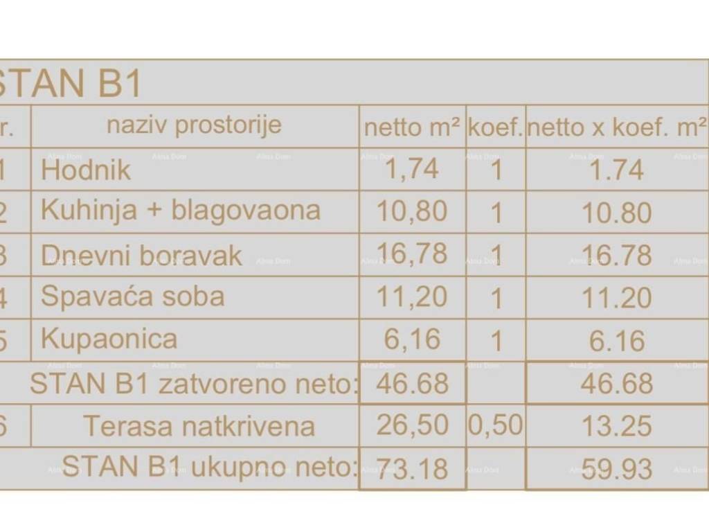 A modern residential project is under construction in an excellent location in Medulin, consisting of two buildings, each with three residential units.Apartment B1, with a total area of 73.18 m² (net area 59.93 m²), is located on the ground floor of building B and consists of: a hallway, a living room with a kitchen and dining area, 1 bedroom, 2 bathrooms, a covered terrace, and a garden of 97.19 m² (net 9.72 m²).The apartment includes a parking space, which is charged additionally.Reservations are now open!For more information, please contact:Azra+385 91 611 5706+385 98 420 885azra@almadominvest.com