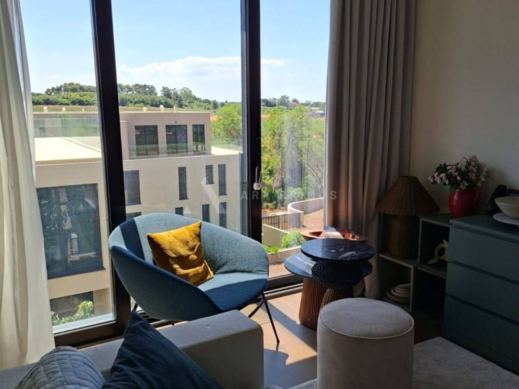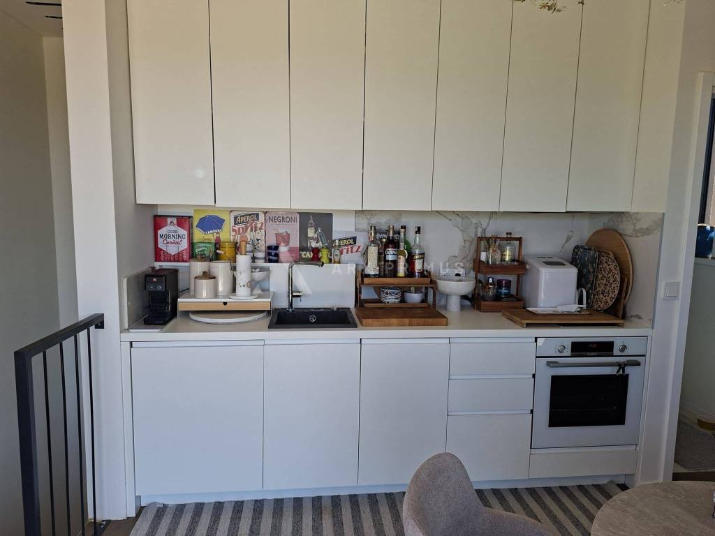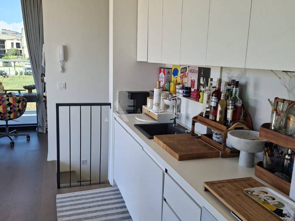 The apartment spans two floors, featuring bright and carefully designed interiors. The lower level offers a spacious living room with a custom kitchen, dining area, and one bedroom with an en-suite bathroom. An elegant staircase leads to the upper floor, which includes two additional bedrooms, each with a private bathroom, and a second fully equipped kitchen.