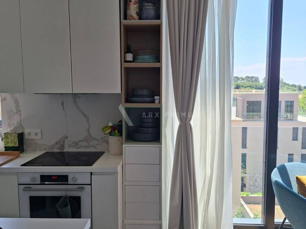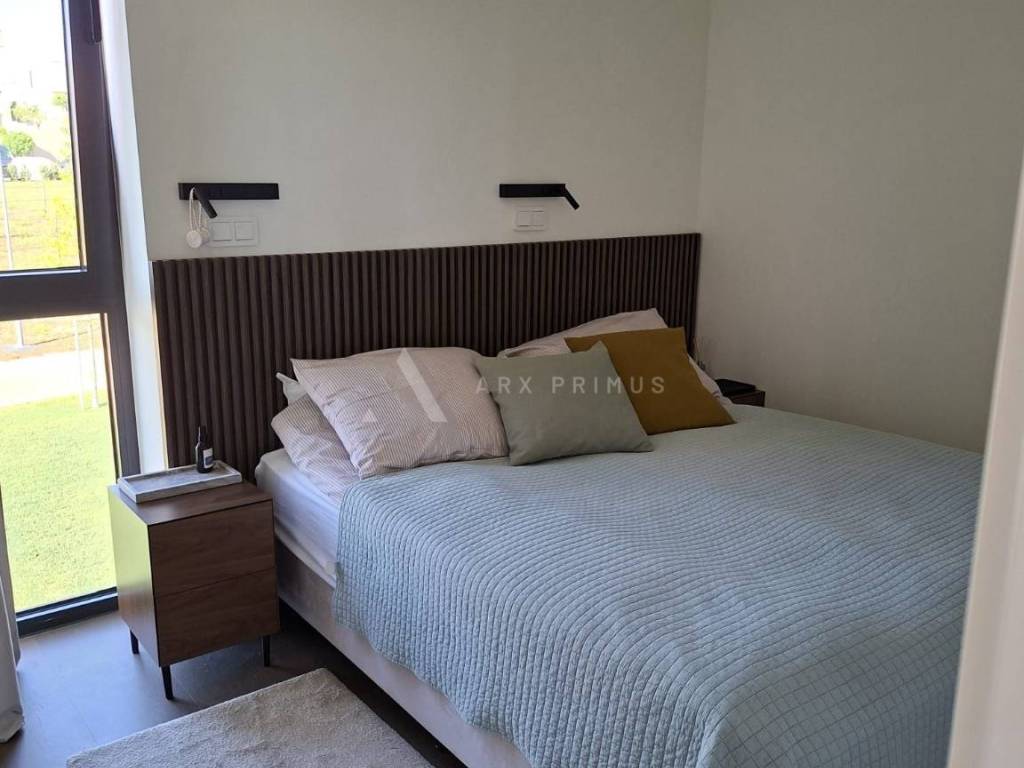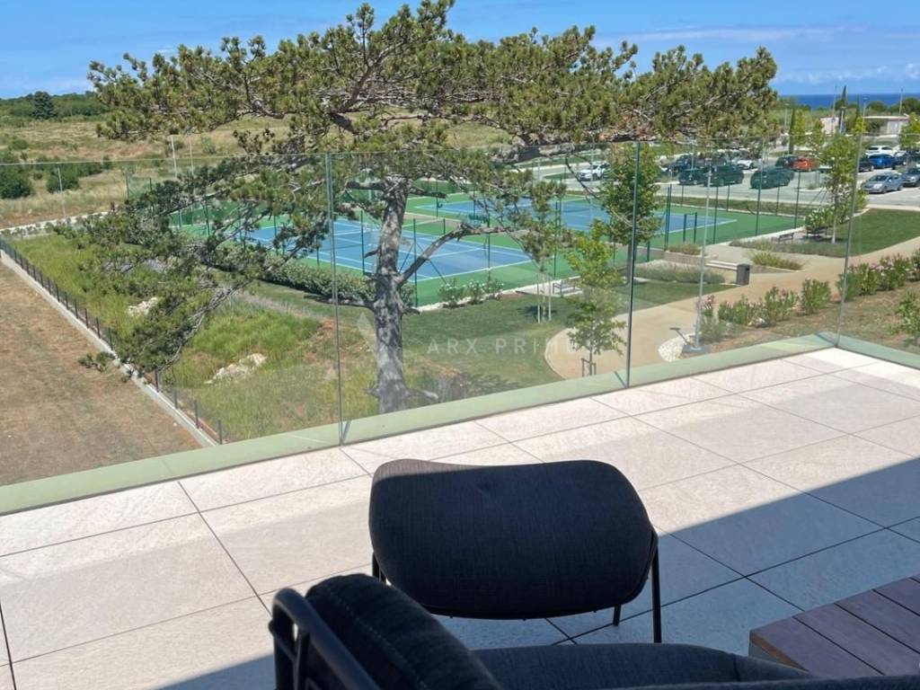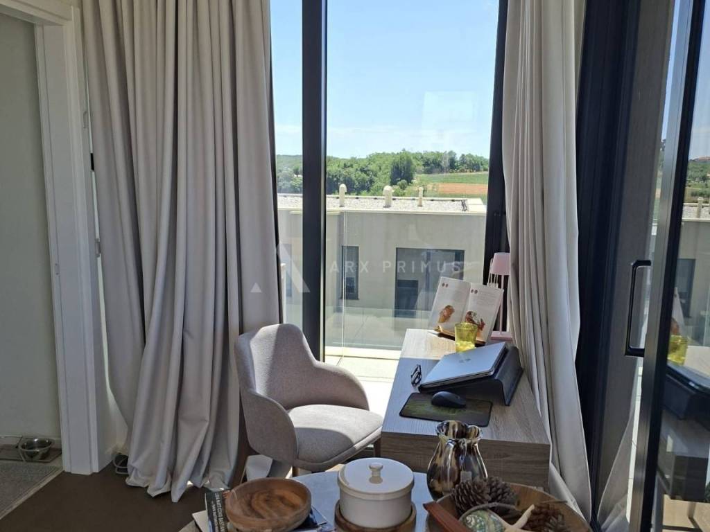 An exclusively furnished duplex apartment with 3 bedrooms, 4 bathrooms, and a spacious rooftop terrace with panoramic sea views is for sale, located in the prestigious Petram Resort & Residences on Crveni Vrh, near Umag.