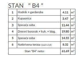 For sale: apartments in a new project, Pula!Residential project in Pula, building with three floors and 12 residential units.Apartment B4, with an area of 61.69 m², is located on the ground floor of the building and consists of: hallway + wardrobe, living room with kitchen and dining area, 2 bedrooms, bathroom, and covered terrace. The apartments will be equipped with inverter air conditioning, underfloor heating in the bathrooms, and high-quality tiles and flooring. The apartment comes with two parking spaces. Move-in is expected at the end of 2026.For more information, please contact:Info: +385 91 611 57 06 +385 98 420 885 azra@almadominvest.com