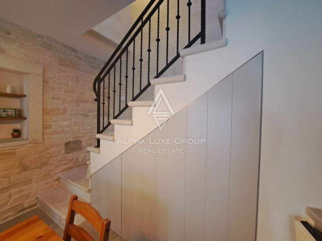 The ground floor features a contemporary kitchen connected to the dining and living area, with direct access to a terrace and landscaped garden, as well as a discreet storage and laundry space beneath a traditional stone staircase. Upstairs, there is a comfortable bedroom with terrace access overlooking greenery and a modern bathroom. Within the yard, a separate garden house provides an additional bedroom with its own bathroom, creating extra privacy for guests or rental potential. Heating and cooling are provided by air conditioning, and the house is sold fully furnished with quality interior finishes following a complete renovation in 2015.