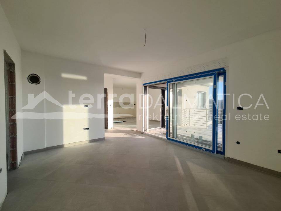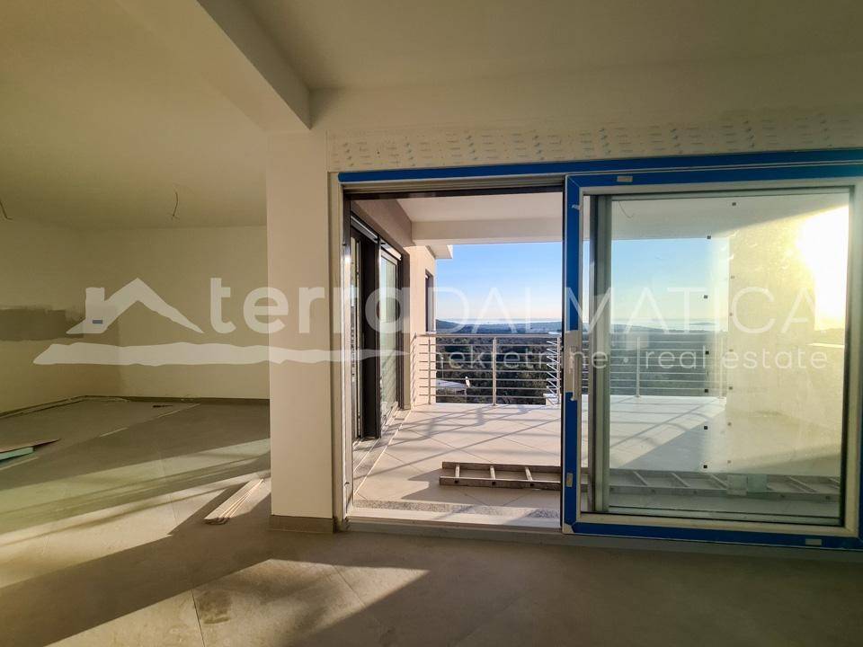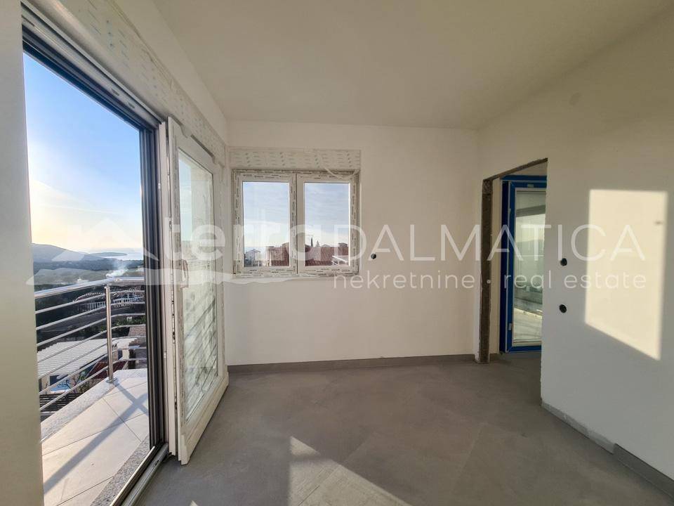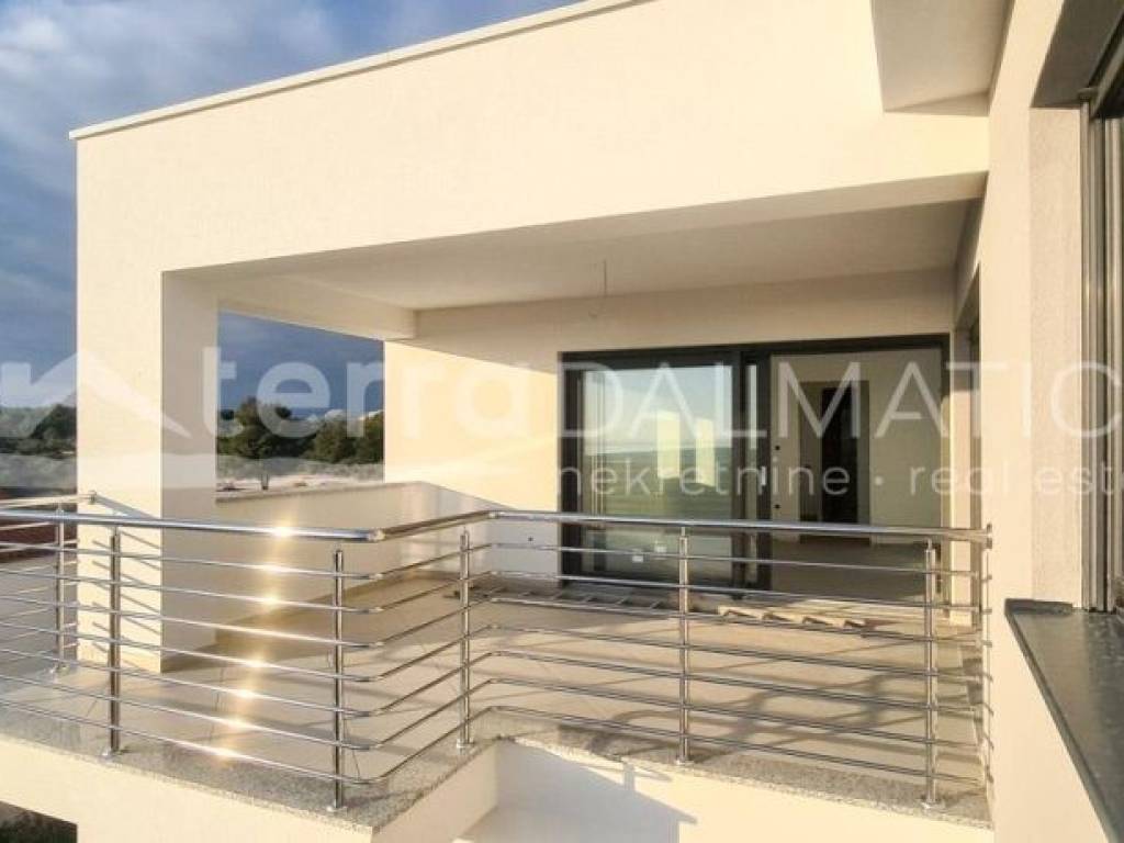 A comfortable apartment with a sea view is for sale in Primosten. It is located on a hill above Primosten, in a building whose complete completion and moving in will be by the summer of 2021. The special feature of the apartment is a large covered terrace of over 18 m2 with a beautiful sea view. There are two bathrooms one of which is within one of the bedrooms. The apartment also has one outdoor parking space and a storage room in the basement. The apartment will be installed three air conditioners, underfloor heating in the bathrooms, security doors. All outdoor air conditioning units will be pulled to the roof of the building. Possibility of installing a fireplace because the apartment has a chimney opening. The apartment is in a semi-detached building with a flat roof where one side is retracted relative to the other, so the terrace provides intimacy. Distance from apartment to the center of Primosten is 2.5 km. Primosten is a tourist center with beautiful long pebble beaches, one of the most prestigious tourist destinations in Dalmatia.