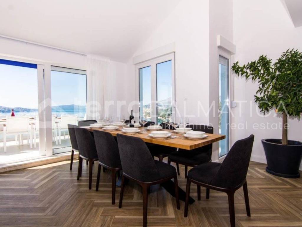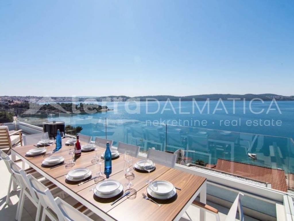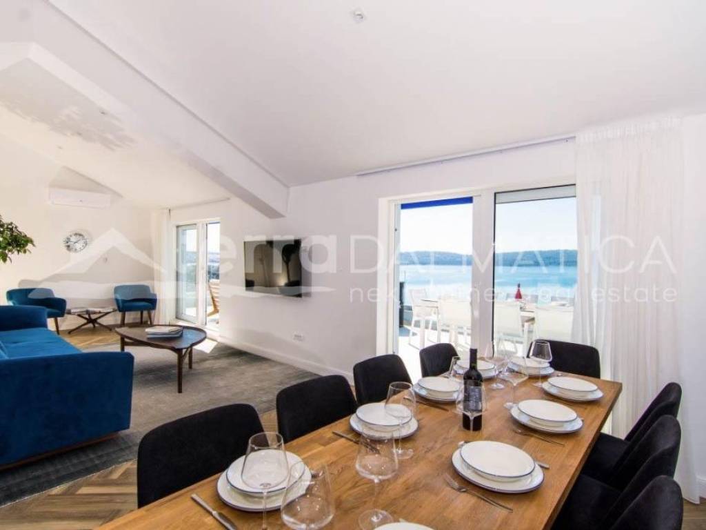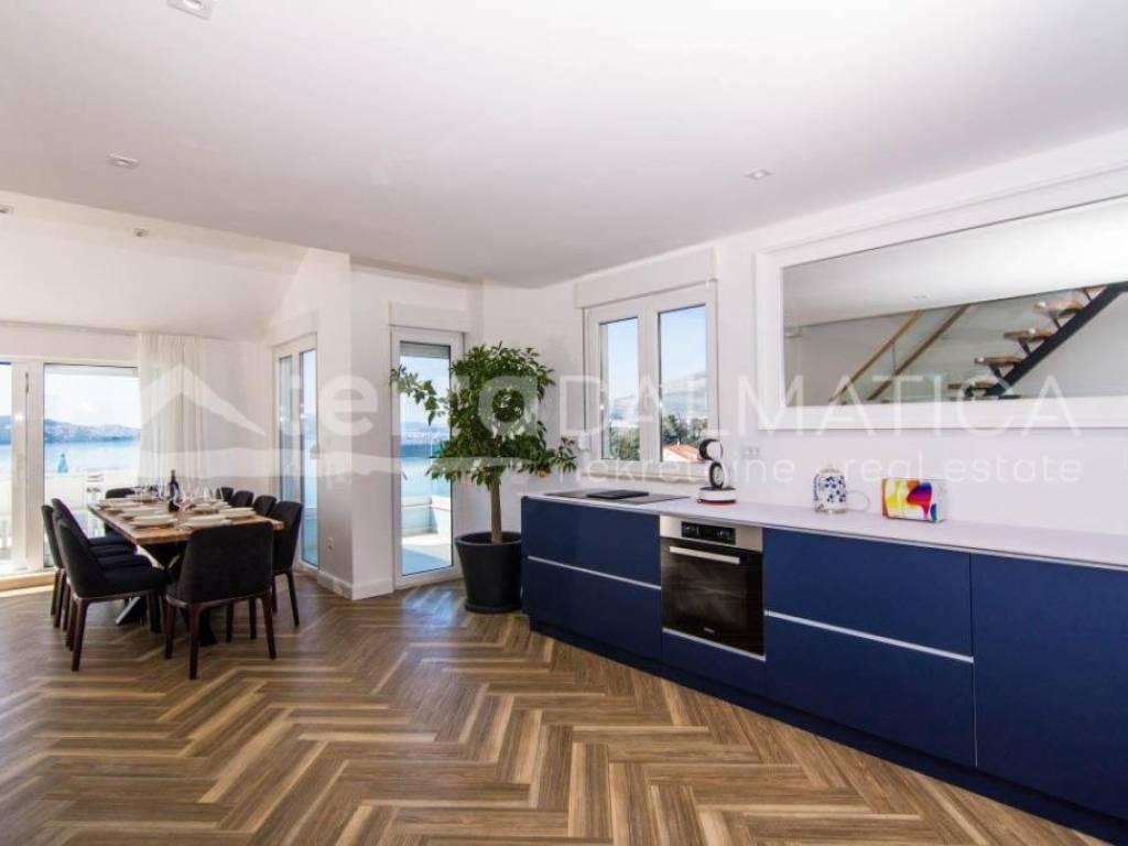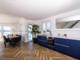 A five bedroom penthouse with a spacious terrace and a unique view is for sale in Trogir, 50m from the sea. The penthouse is designed as a two-story apartment with a total living area of 185.83 m2, of which the ground floor covers 122.29 m2, and the upper floor 63.54 m2. The lower floor also opens onto a 46m2 terrace. The apartment is harmoniously furnished and well maintained, and is sold with furniture. The apartment has two spacious garages, each of 17 m2, and an outdoor parking space. On the lower floor there is a living area, which is designed in an open style. In addition, three rooms with attached bathrooms are located on the lower floor, and two more rooms with bathrooms are on the upper floor. The spacious living room leads directly to the terrace. Considering the position of the apartment at the top, the terrace offers an open view of the sea with an imperceptible connection between the apartment and the sea horizon. A marina for luxury yachts will be built nearby, which will contribute to the additional attractiveness of the view. The arranged access to the beautiful pebble beach is located in the immediate vicinity. Trogir is a charming town located between the cities of Split and Sibenik. In the immediate vicinity of the city is the Split airport, a beautiful marina, many quality restaurants, coffee bars, shops and other amenities necessary for everyday life. The entire part of the old town is on the list of world heritage under the protection of UNESCO. Contact our agent and arrange a tour of the property.