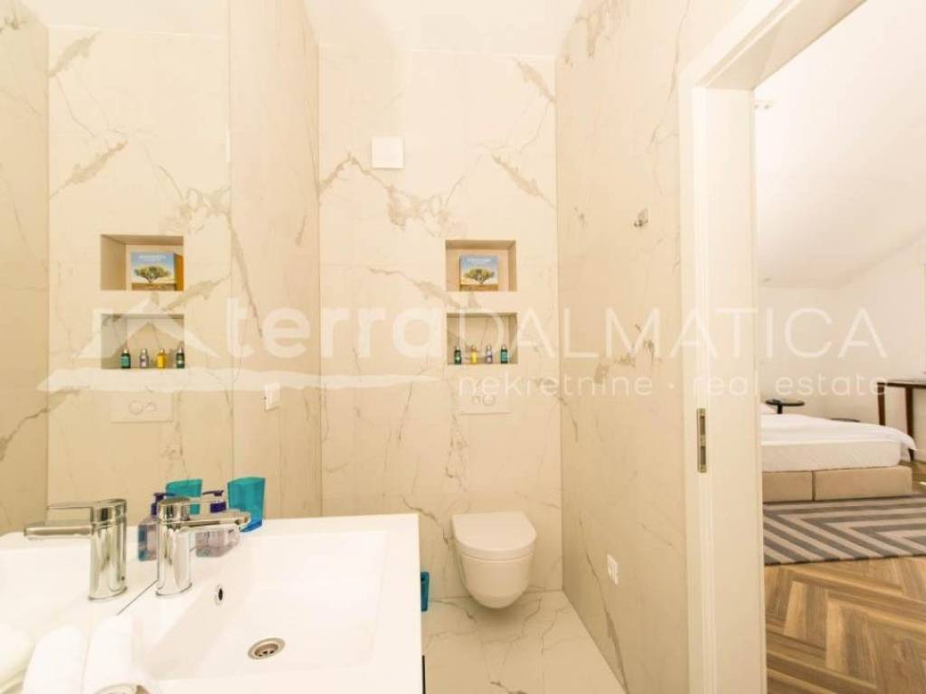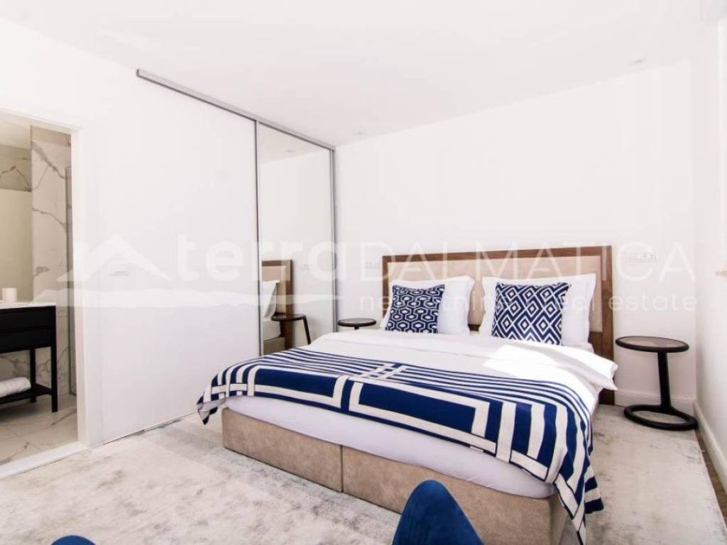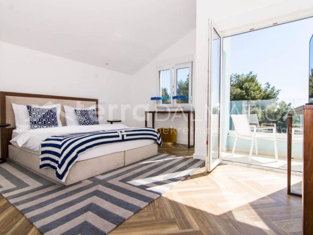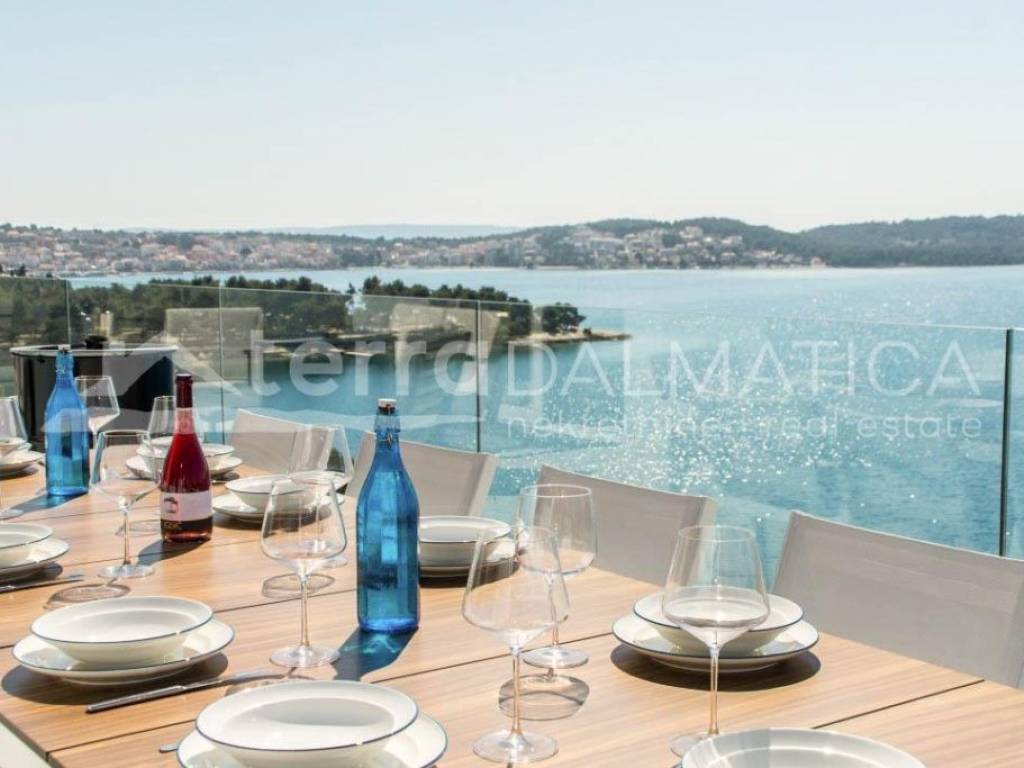 A five bedroom penthouse with a spacious terrace and a unique view is for sale in Trogir, 50m from the sea. The penthouse is designed as a two-story apartment with a total living area of 185.83 m2, of which the ground floor covers 122.29 m2, and the upper floor 63.54 m2. The lower floor also opens onto a 46m2 terrace. The apartment is harmoniously furnished and well maintained, and is sold with furniture. The apartment has two spacious garages, each of 17 m2, and an outdoor parking space. On the lower floor there is a living area, which is designed in an open style. In addition, three rooms with attached bathrooms are located on the lower floor, and two more rooms with bathrooms are on the upper floor. The spacious living room leads directly to the terrace. Considering the position of the apartment at the top, the terrace offers an open view of the sea with an imperceptible connection between the apartment and the sea horizon. A marina for luxury yachts will be built nearby, which will contribute to the additional attractiveness of the view. The arranged access to the beautiful pebble beach is located in the immediate vicinity. Trogir is a charming town located between the cities of Split and Sibenik. In the immediate vicinity of the city is the Split airport, a beautiful marina, many quality restaurants, coffee bars, shops and other amenities necessary for everyday life. The entire part of the old town is on the list of world heritage under the protection of UNESCO. Contact our agent and arrange a tour of the property.