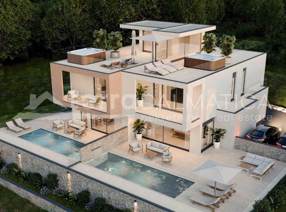 Let your lifelong dream of owning your own vacation villa come true in this enchanting semi-detached house with an incredible view of the endless blue of the Adriatic Sea and the picturesque Sibenik archipelago. This luxury duplex located in a quiet newly built neighborhood with villas is a combination of elegance, comfort and beautiful surroundings. The villa extends over two floors, with access to the roof terrace. On the ground floor there is a spacious open concept kitchen, dining room and living room, carefully designed for maximum comfort and functionality. The large sliding door in the living room provides a beautiful view of the environment, while at the same time special glasses provide protection from the sun. In the rest of the ground floor there is also an entrance area, a bedroom and a bathroom. Internal stairs lead to the first floor where there is a hallway, a master bedroom with its own bathroom, dressing room and a covered terrace, two additional bedrooms and another bathroom for the complete comfort of you and your family. The stairs further lead to the roof terrace with water and electricity connections, which you can turn into a relaxing oasis with a jacuzzi to enjoy beautiful sunsets. In the yard, a heated swimming pool of 22 m2 is planned for relaxation from spring to autumn, while the rest of the yard will be beautifully landscaped. Equipped with air conditioners and underfloor heating via a heat pump, this house ensures a comfortable temperature throughout the year. Your safety is also a priority, thanks to the video surveillance system. This property represents the perfect combination of luxury, comfort and beautifully landscaped surroundings, providing you with a unique opportunity to enjoy the lifestyle at the highest level. Vodice is a Dalmatian tourist resort, known for its numerous and long beaches, bicycling paths, and a variety of tourist and hospitality offers. They are an excellent starting point for visiting the national parks Krka and Kornati, as well as the cities of Sibenik, Split, Zadar... Contact our agent and schedule your tour. Note: Renderings are used in the ad.