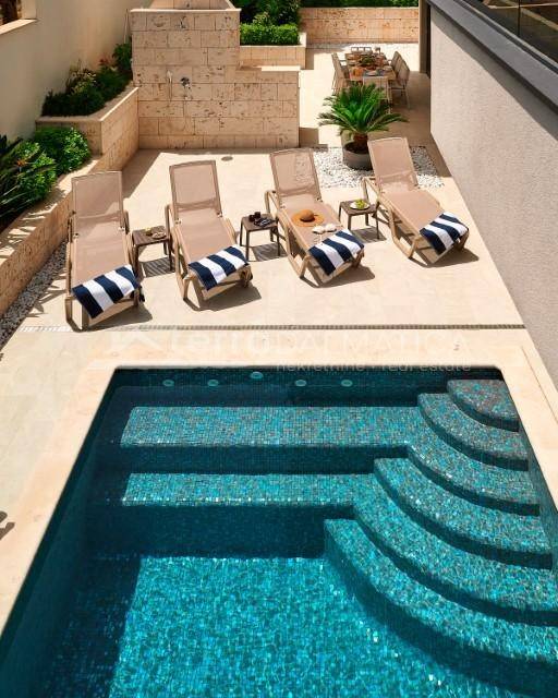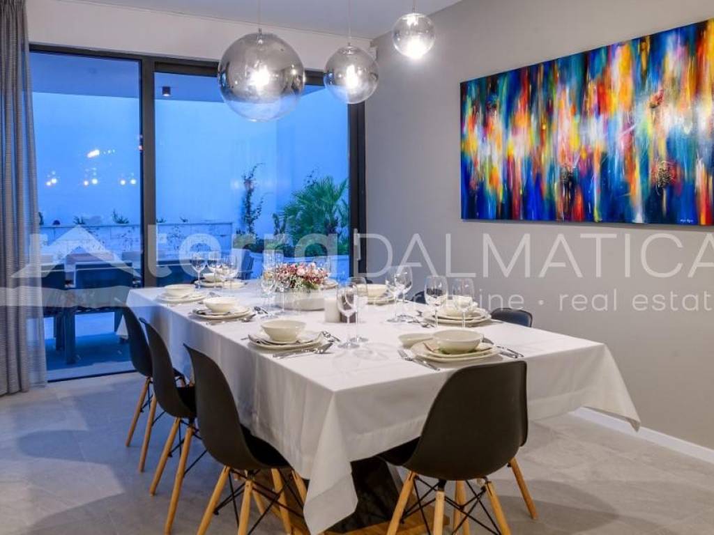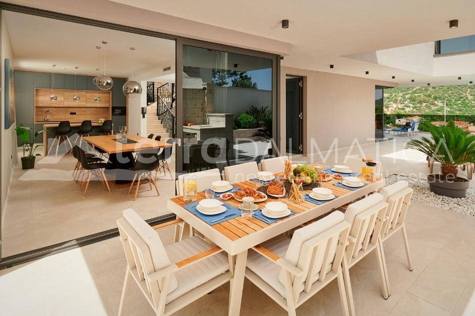 The interior of the villa is designed in a modern style: on the ground floor there is a spacious living area with large glass walls that provide a panoramic view of the sea and access to the terrace. From the living room you can access the open-concept kitchen, which is equipped with all the necessary high-quality appliances. The dining room is also part of the open concept and from the dining room you can also go out to the spacious terrace that is perfectly integrated with the living area. There is also a guest toilet. On the terrace there is an infinity pool surrounded by sun loungers for enjoying the sun, overlooking the Adriatic Sea. There is also an outdoor shower next to the pool, and the outdoor area also includes a dining area with a stone barbecue, on a plot of 800 m², ideal for socializing in a relaxed atmosphere.
