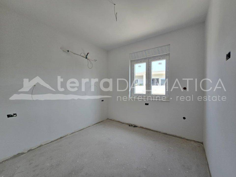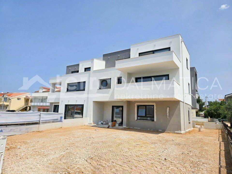 A penthouse in a newly constructed building is for sale, located in a peaceful area of Brodarica, just 100 meters from the sea – ideal for those seeking a high-quality home or an attractive investment close to the coast. The apartment is situated on the second floor and consists of a hallway, three bedrooms, a walk-in closet, three bathrooms, a spacious living room connected to the kitchen and dining area, which opens onto a large terrace of 27 m². Additionally, the apartment has a balcony of 2.50 m². The net usable area of the apartment is 98.14 m², with the terrace and balcony not included in this calculation. Two private parking spaces are included in the price. Attention has been given to the quality of construction and finishing. Underfloor heating is installed in the living room and bathrooms, ensuring additional comfort during the winter months. The exterior joinery is made with triple glazing, contributing to energy efficiency, sound insulation, and a sense of privacy. The apartment is ready for occupancy in a short time. For more information, viewings, and availability details, feel free to contact us.