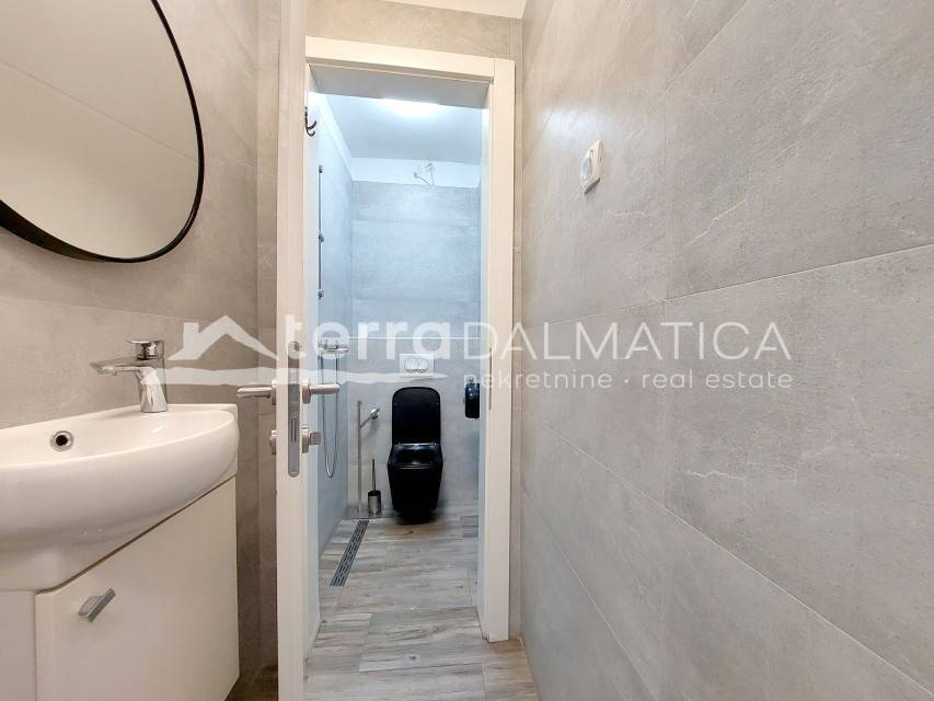 The apartment is located on the ground floor of a newer residential building and has a total area of ​​48.5 m2. It consists of a kitchen, dining room and living room connected into one functional unit, one bedroom, separate bathroom and toilet, as well as an additional mini bathroom with toilet inside the bedroom.