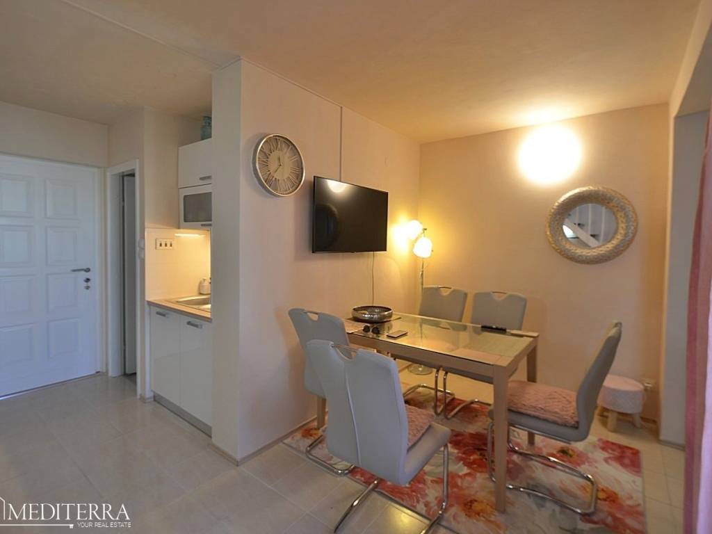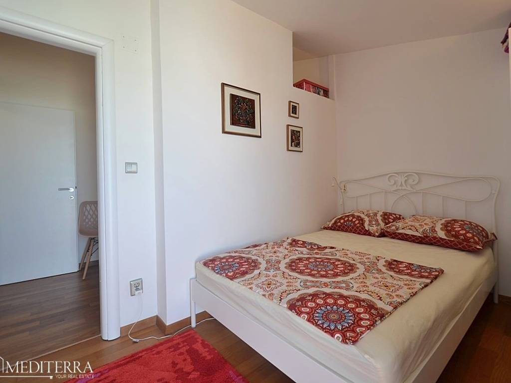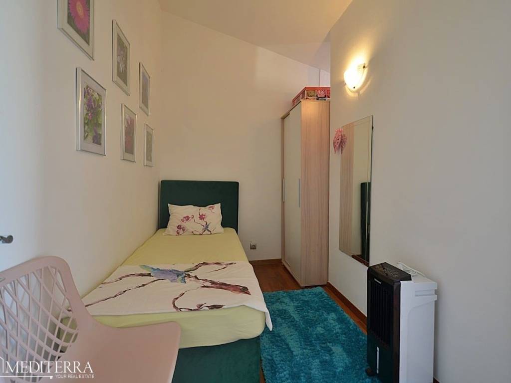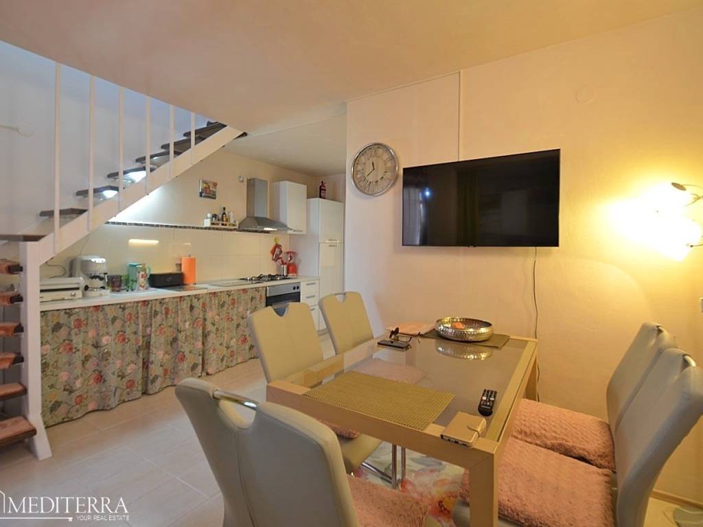 The apartment has two bedrooms, which makes it suitable for a family or as an investment for tourist rental. The lower floor is tiled with ceramics, while the upper floor has parquet flooring, which gives the space a pleasant combination of functionality and warmth.