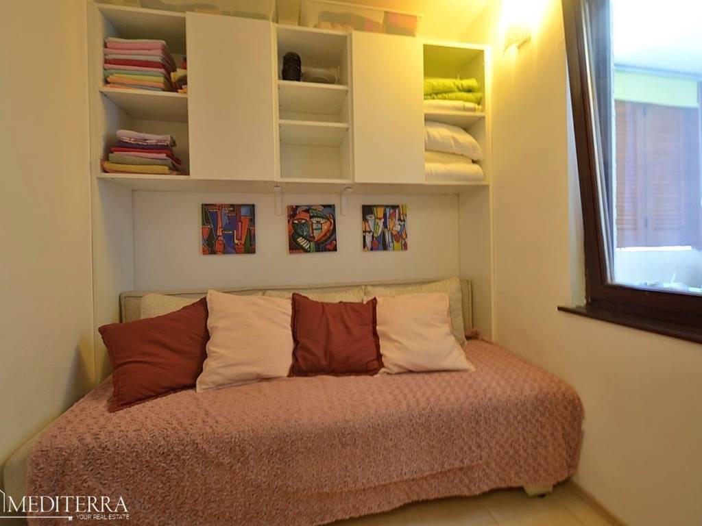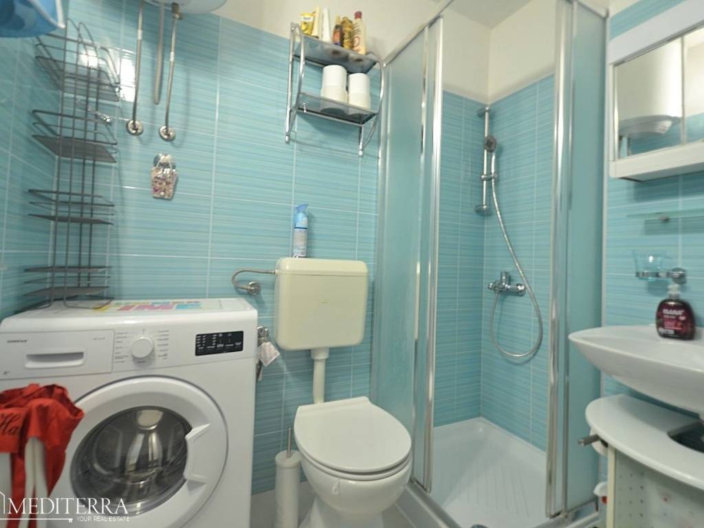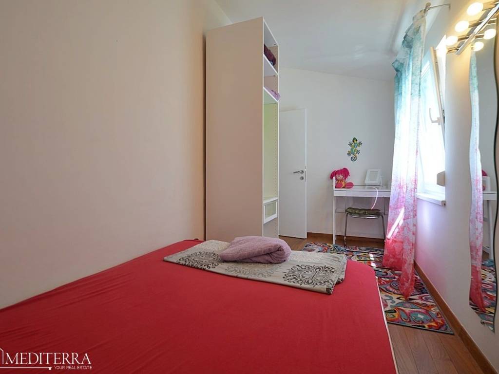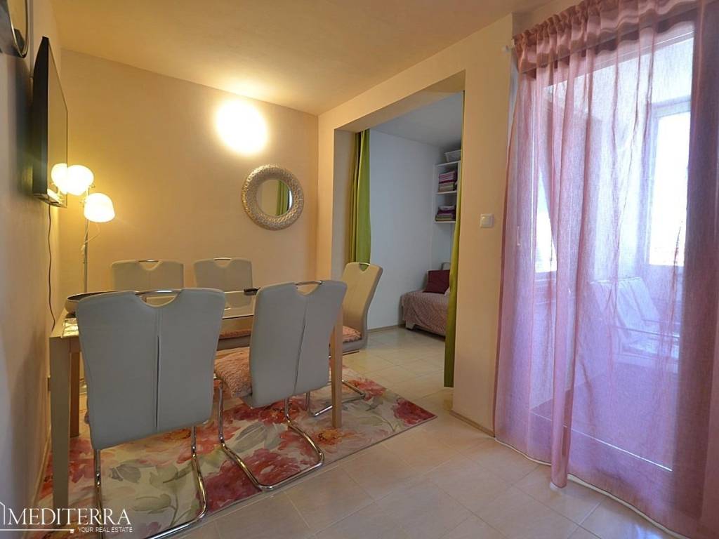 The apartment has two bedrooms, which makes it suitable for a family or as an investment for tourist rental. The lower floor is tiled with ceramics, while the upper floor has parquet flooring, which gives the space a pleasant combination of functionality and warmth.