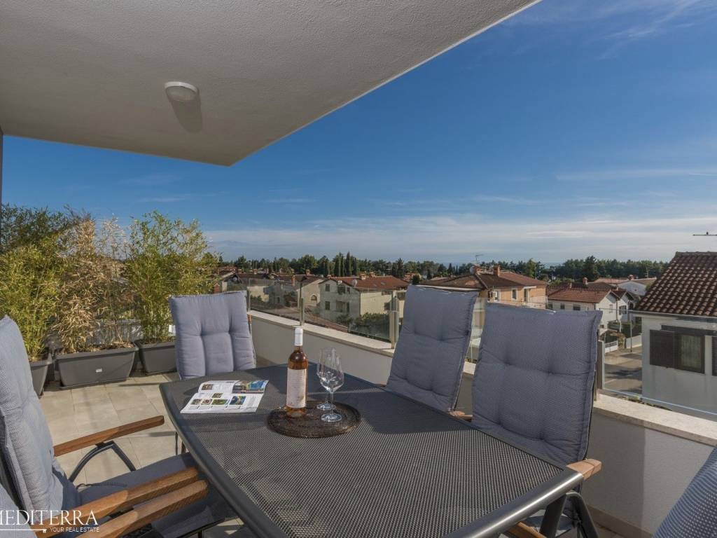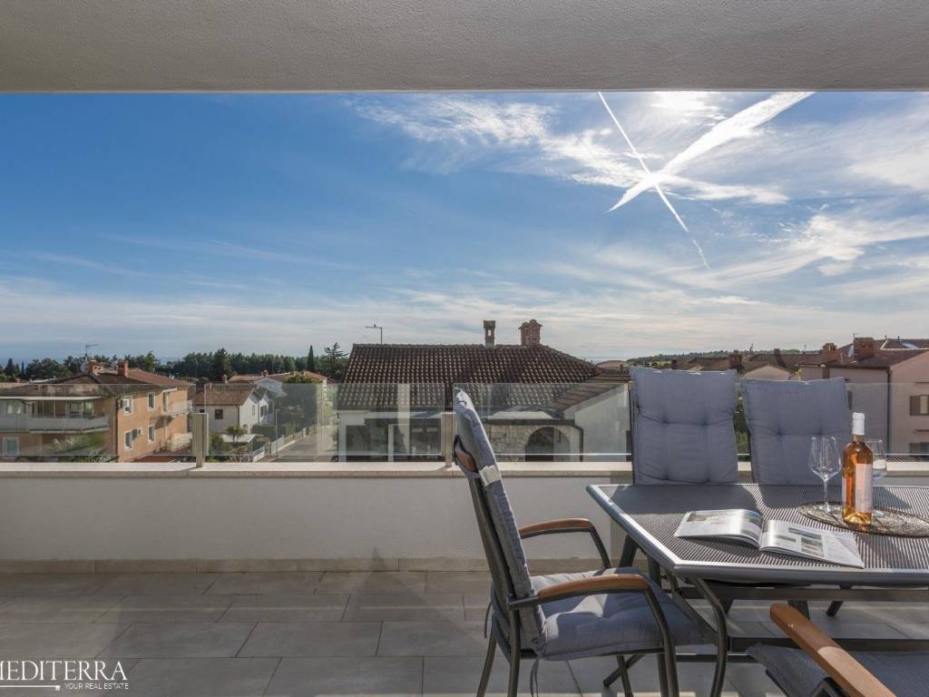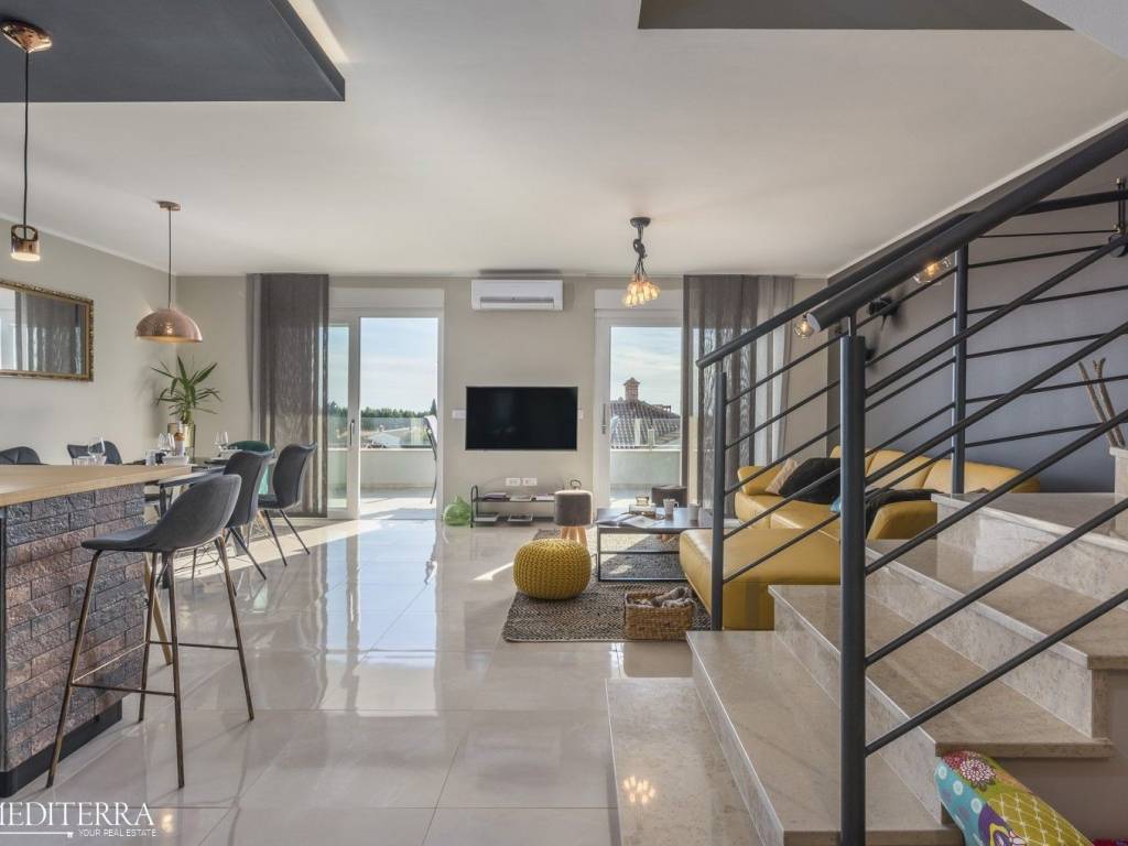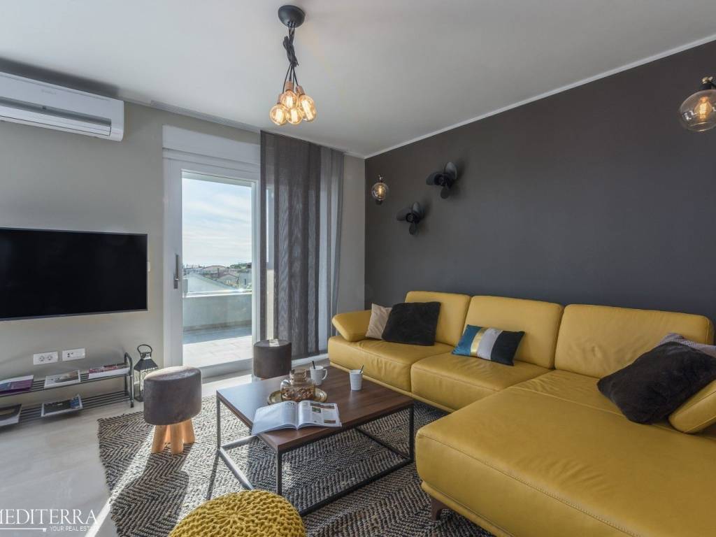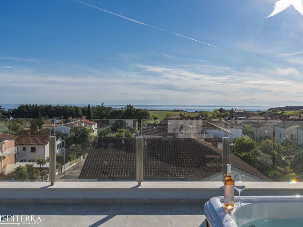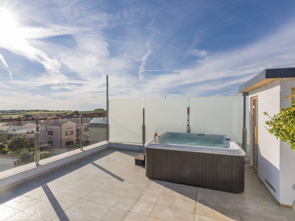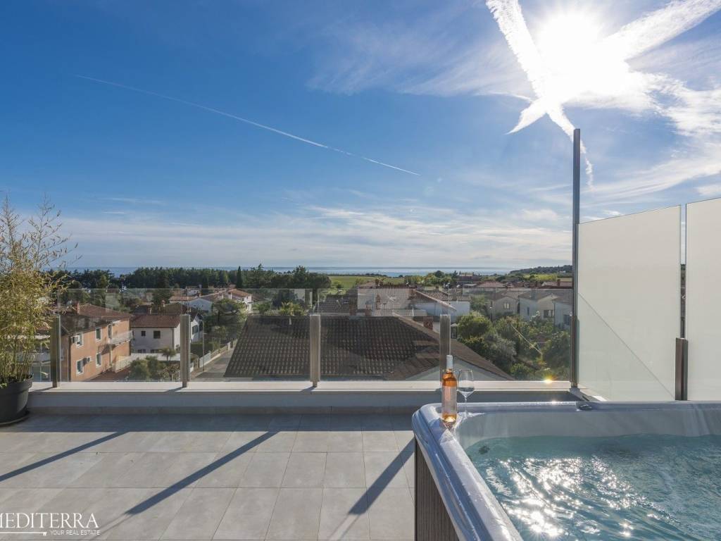 Exclusive penthouse with sea view for sale. The apartment is located in a prime location just 400 meters from the most beautiful Novigrad beach. The apartment is on the second floor of a residential building and consists of an entrance hall, kitchen, dining room and living room, three bedrooms, three bathrooms, a sauna and jacuzzi. The apartment has two covered terraces, as well as a private exit to the 51m2 roof terrace. The apartment also has two parking spaces. Each room has an air conditioning unit for cooling and underfloor heating throughout the apartment with a heat pump.