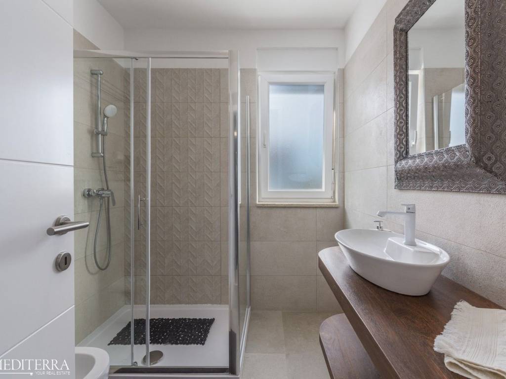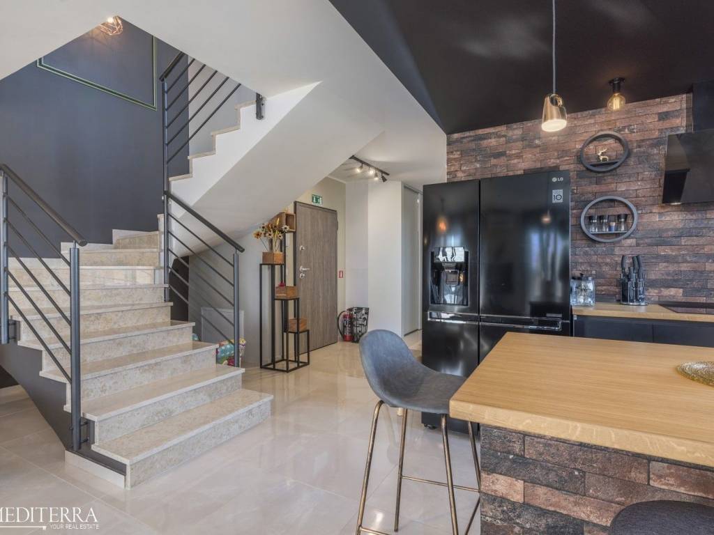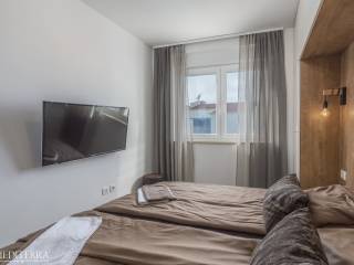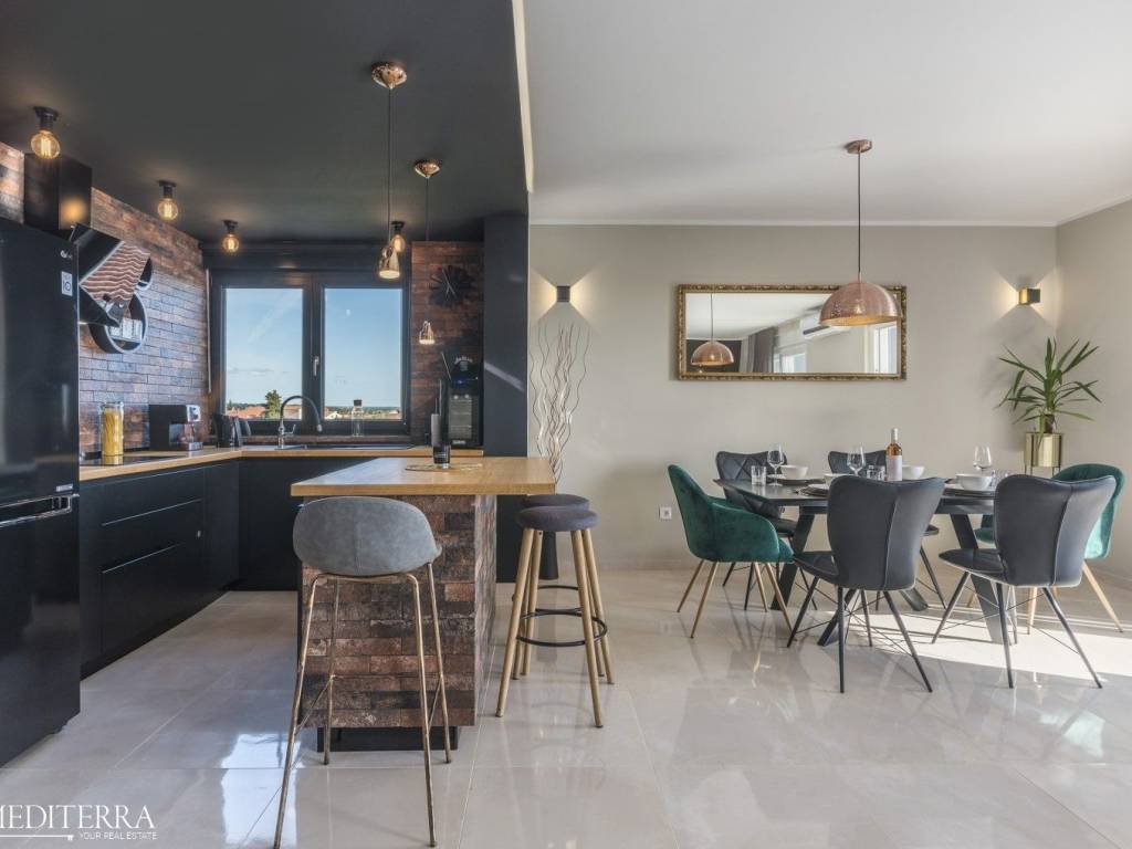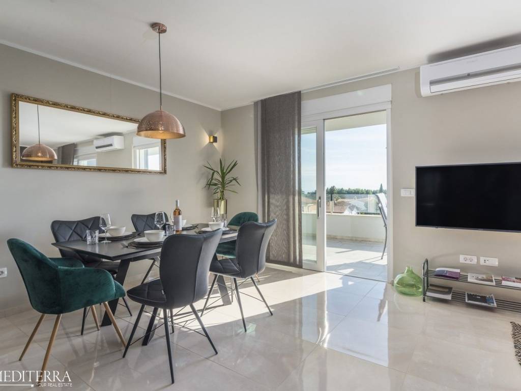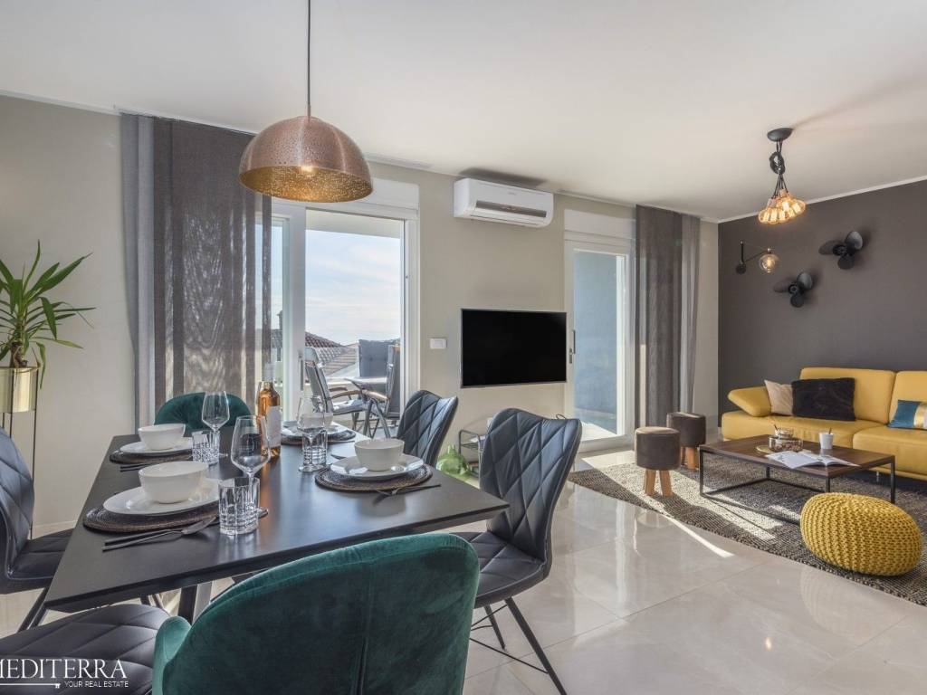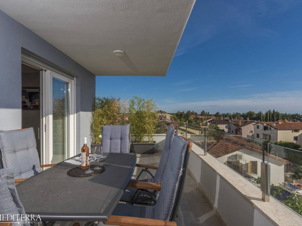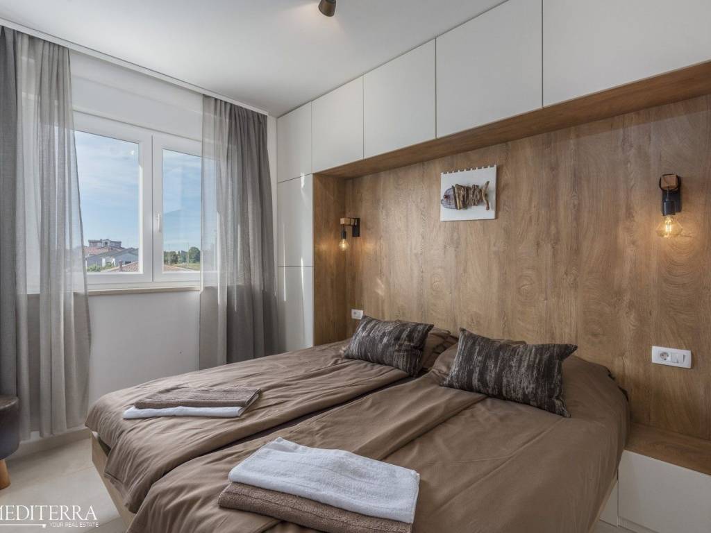 Exclusive penthouse with sea view for sale. The apartment is located in a prime location just 400 meters from the most beautiful Novigrad beach. The apartment is on the second floor of a residential building and consists of an entrance hall, kitchen, dining room and living room, three bedrooms, three bathrooms, a sauna and jacuzzi. The apartment has two covered terraces, as well as a private exit to the 51m2 roof terrace. The apartment also has two parking spaces. Each room has an air conditioning unit for cooling and underfloor heating throughout the apartment with a heat pump.