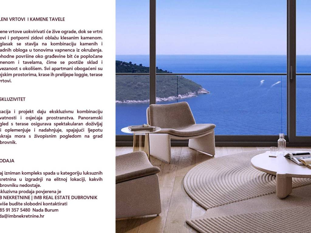 CALL FOR PRICE. LUXURY APARTMENTS - PANORAMIC SPECTACULAR VIEW OF HISTORIC DUBROVNIK AND THE SEAAPARTMENTS | 110 m2 - 280 m2 | SPACIOUS TERRACES | LOGGIA | GARDENS TOP OPPORTUNITY! INVESTMENT OPPORTUNITY! EXCLUSIVE OPPORTUNITY! LUXURY COMFORT PENTHOUSE - Possibility of a swiming pool Parking | Garage | ELEVATOR INVESTMENT: Do not miss the opportunity to buy a property in a micro location that guarantees continuous growth in value in the future! You are in one of the last locations where it is possible to buy a new building with a view of the city center. The most profitable location for investment! Contact us now if you are interested in this exclusive Dubrovnik story. We hereby present a dream opportunity - we offer you to become the owner of one of the top apartments with a panoramic view of the City, or more of them and become the owner of an urban villa. This EXCLUSIVE NEW BUILDING offers luxury and comfort in the most desirable location in Dubrovnik. The prestigious address known for its exclusive properties offers maximum privacy and an incredible visual spectacle. The view extends to the historic core of Dubrovnik, the open sea, the island of Lokrum, the Elaphites and spectacular sunsets. The luxurious modern building provides a high standard and aesthetics. Surrounded by high and low greenery, everything exudes the harmony of nature and luxury. Quality construction and carefully selected materials ensure comfort and durability. All apartments have an enchanting panoramic view and a combination of luxury and elegance. They are spacious and provide comfort and functionality. The terraces and panorama are breathtaking! The old town of Dubrovnik is within easy reach. Popular beaches and luxury restaurants are nearby. If you strive for the ultimate life experience, if you want to always feel the new excitement of exploring the most beautiful natural city that is a brand in the world - the unique and inimitable Dubrovnik, to rest peacefully in a luxurious and spectacular panoramic view, this apartment is what you are looking for. Welcome to the world of endless elegance and luxury, an extraordinary experience offered by these apartments. The rarity of the property makes it special, this apartment will make you the proud owner of a truly outstanding and profitable investment. Don't miss the opportunity. Contact us now: EXCLUSIVE SALE - IMB NEKRETNINE DUBROVNIK +385 91 333 5480| +385 91 331 5480