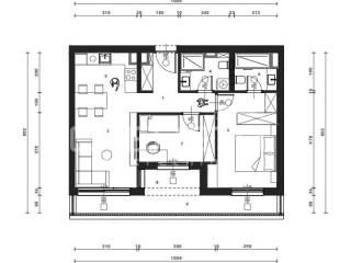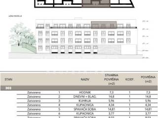 Sastoji se od ulaznog hodnika, kuhinje s blagovaonicom i dnevnog boravka, 2 spavaće sobe, 2 kupaonice, loggie i terase. Uz stan je potrebno kupiti garažno mjesto i spremište.