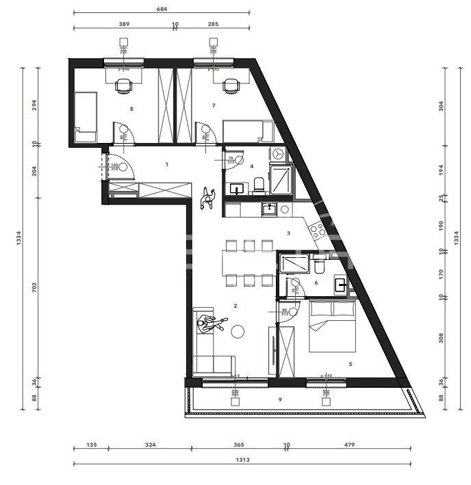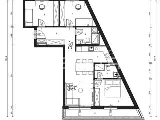 Sastoji se od ulaznog hodnika, kuhinje s blagovaonicom i dnevnog boravka, 3 spavaće sobe, 2 kupaonice i terase. Uz stan je potrebno kupiti garažno mjesto i spremište.