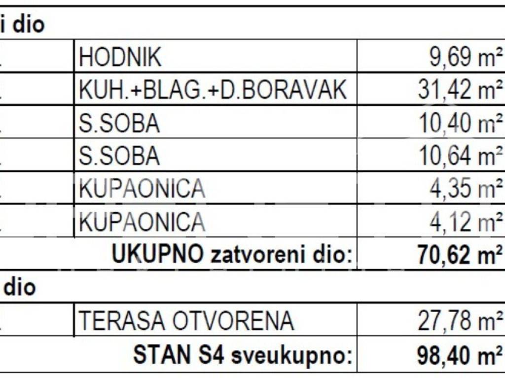 Stan S04 ima bruto površinu 113,56 m2 (98,40 m2 stan; 2,66 m2 spremište; 12,5 m2 vanjsko parkirno mjesto).