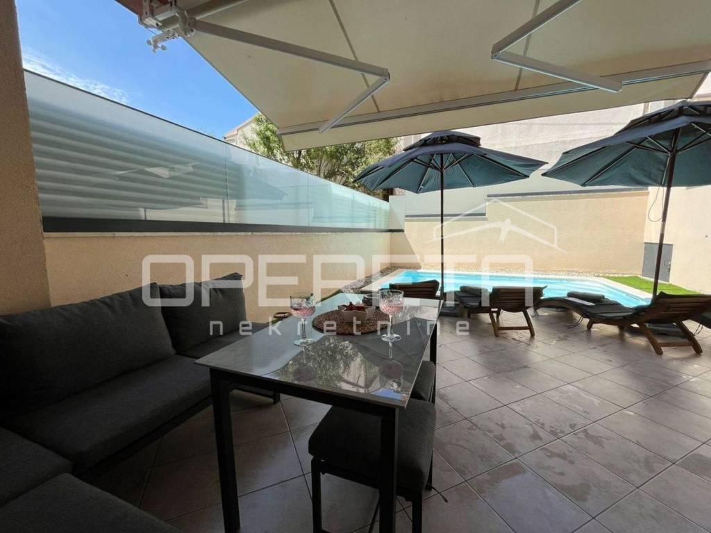 The apartment consists of two bedrooms, a spacious living room with dining area and kitchen, a bathroom, an additional toilet, hallway, and loggia. The highlight of the property are two terraces one covered and one open featuring a private pool with integrated hydromassage and an automated water treatment system using electrolysis, algaecide, and flocculant dosing.