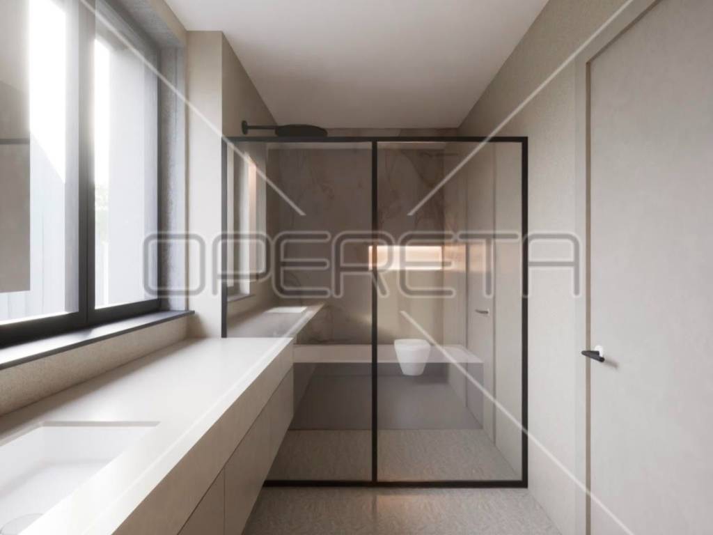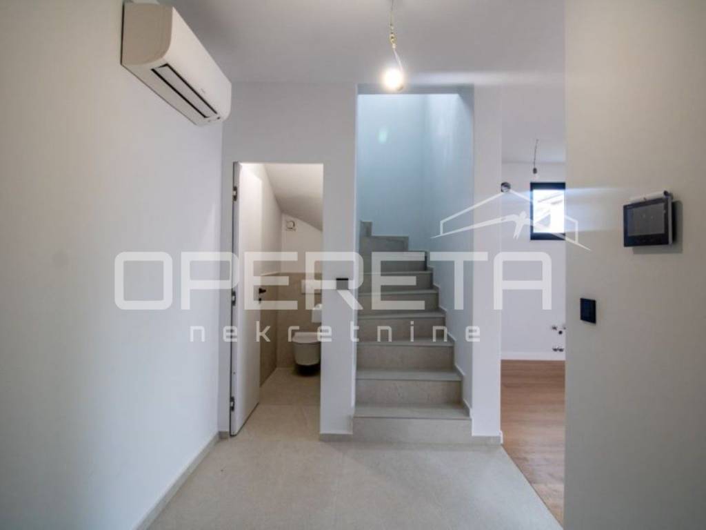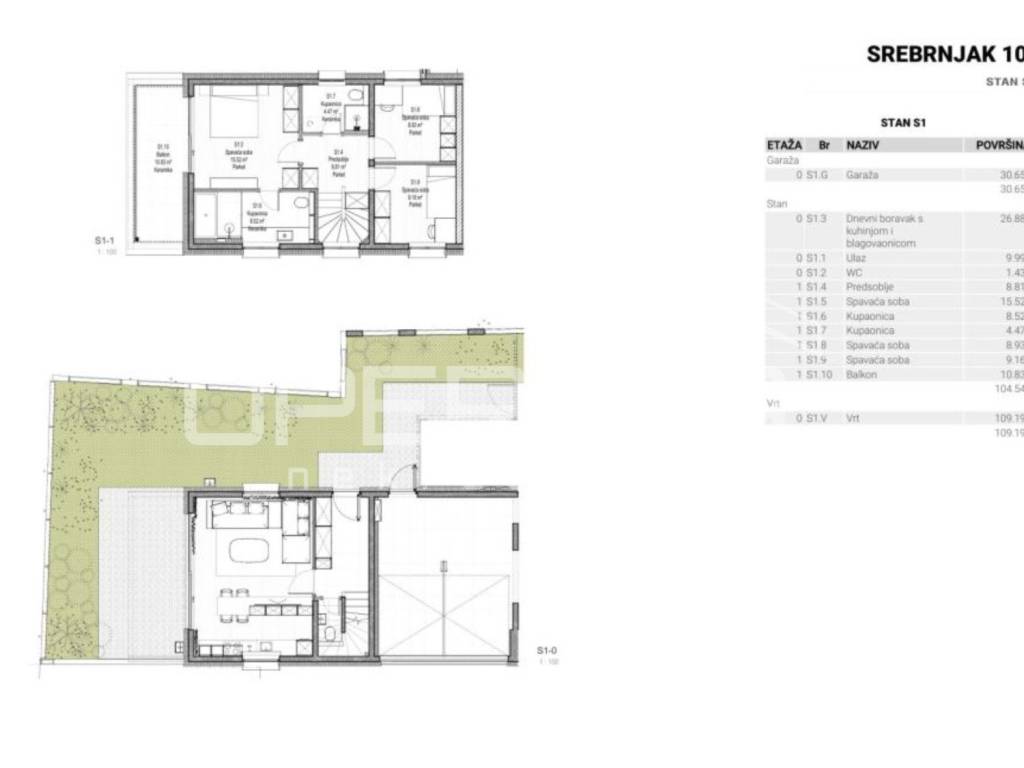 Luksuzan dvoetažan četverosoban stan zatvorene površine 105m2, vrt 109m2, garaža 30,65 m2. Ukupno obračunski NKP 125m2. Sastoji se od predsoblja, dnevnog boravka s kuhinjom i blagovaonicom otvorenog tlocrta s izlazom na terasu i vrt, gostinjskog wc-a na gornjoj etaži, predsoblja, master sobe s garderobom, kupaonicom i izlazom na balkon, dvije spavaće sobe i kupaonice.