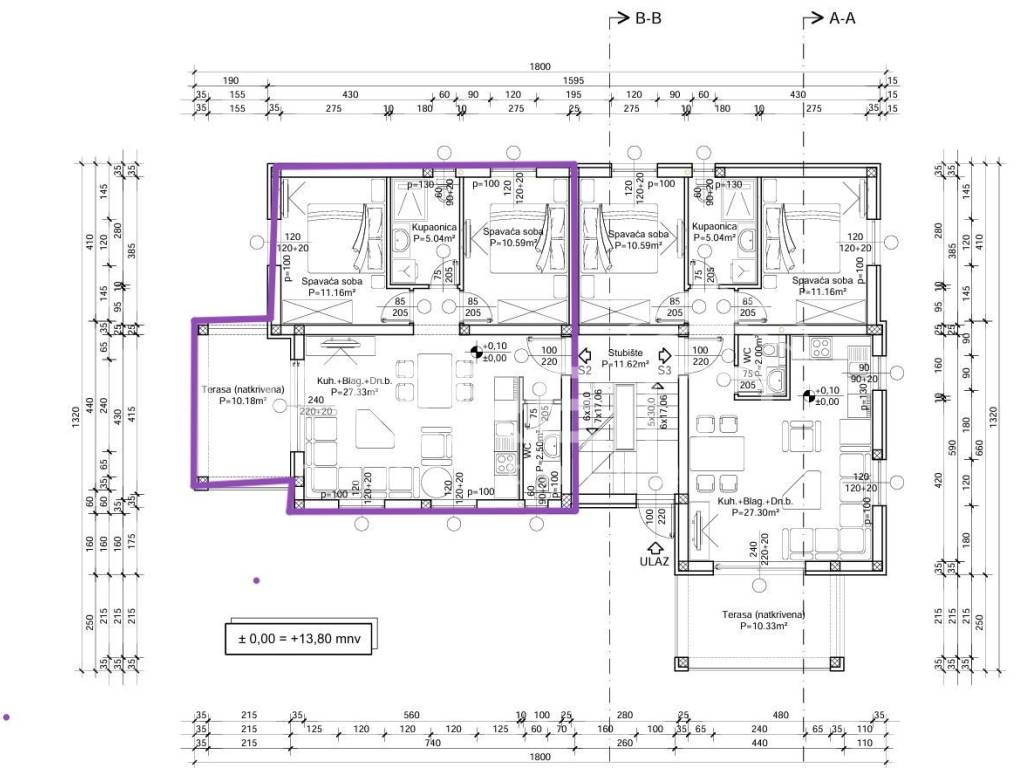 Apartment S2 is located on the ground floor and covers an area of 66.80 m, with an additional covered terrace of 10.18 m perfect for enjoying your morning coffee or watching the sunset. The apartment features two bedrooms, a bathroom, an additional WC, a spacious living room with a kitchen and dining area, and includes a private parking space and storage unit. The entire space is equipped with modern air conditioning units and underfloor heating, ensuring year-round comfort.
