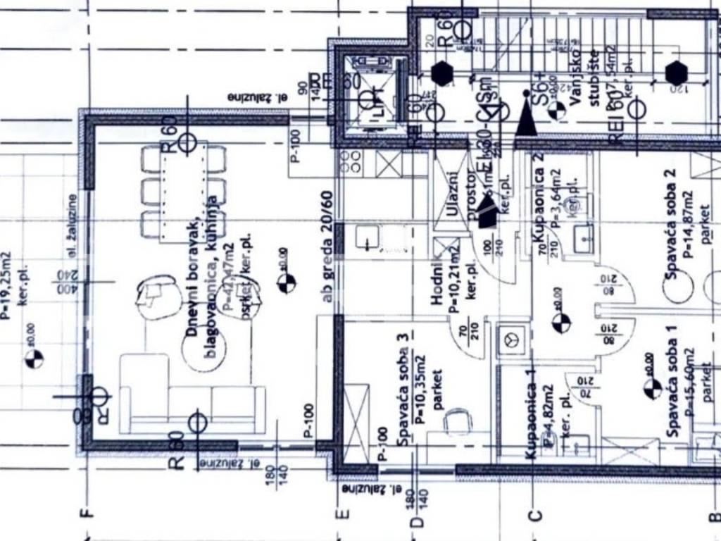 Stan se sastoji od ulaznog prostora, open space kuhinja/boravak (42,5m2), 3 prostorne spavaće sobe 15,6m2, 14,9m2, 10.4m2), dvije kupaone, terasa (19m2), vrt (200m2).