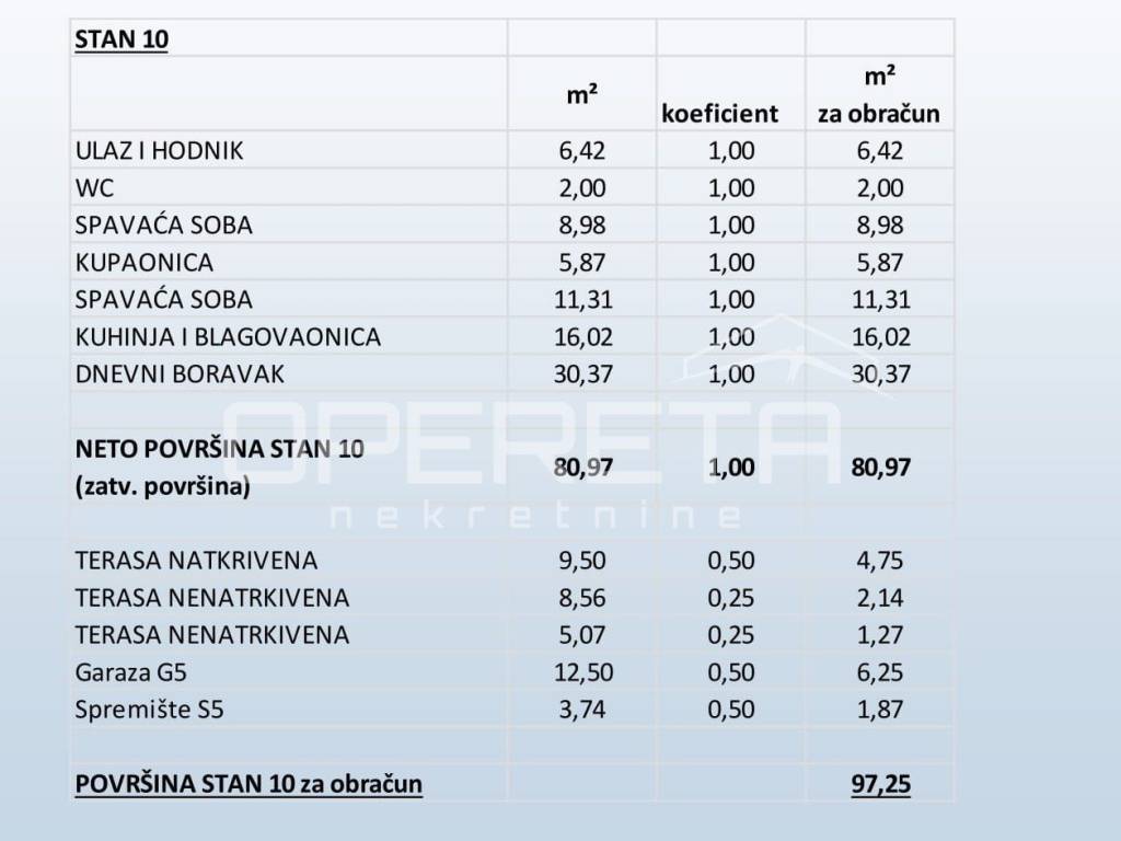 Stan S10 nalazi se na trećem, zadnjem katu zgrade. Sastoji se od 2 spavaće sobe, kuhinje, dnevnog boravka i blagovaonice, kupaonice, toaleta te hodnika. Pripada mu i natkrivena terasa površine 9,50m2, čak 2 nenatkrivene terase, spremište te garažno parkirno mjesto.