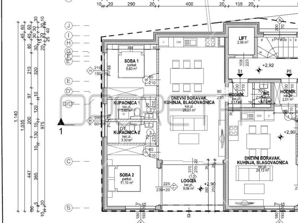The apartment is located on the 1st floor with a sales area of 80.61 m2 (103.07 m2 gross). It consists of two bedrooms, an open living room and kitchen, two bathrooms and a loggia of 11 m2.