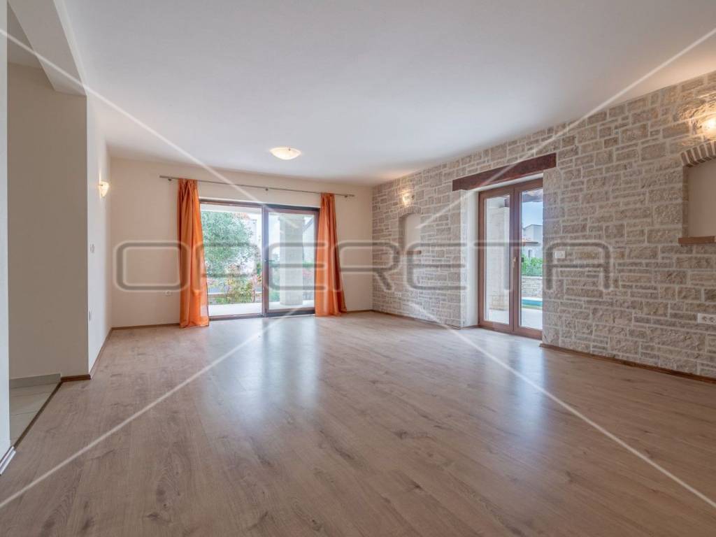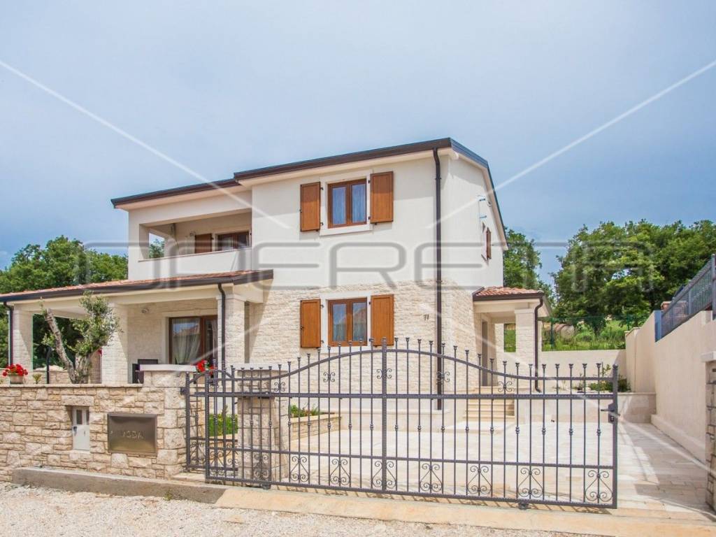 We present to you a beautiful house with a sea view that can be moved into immediately. The house is located not far from the very popular small autochthonous Istrian town of Kaštelir. The house with a total living area of 165 m2 consists of a ground floor and a first floor, the ground floor consists of an entrance hall, a bathroom, a spacious living room with a kitchen and a dining room in one unit, from which there is access to a large covered terrace and a sun deck with a swimming pool that offers a view of sea. On the first floor there are three bedrooms and two large bathrooms. In the basement of the house there is an additional room of approx. 30m2 that can be used as a storage room. The place where the villa is located is known for its excellent gastronomic offer, the best wines and even better olive groves, and it is only about 10 km from the beaches in the city of Poreč.
