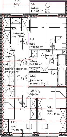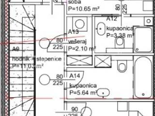 Kuća u nizu koja se sastoji od dnevnog boravka, blagovaonice, kuhinje, WC-a, terase, trijema, ulaznog prostora, spremišta i prostorije sa sustavom za grijanje u prizemlju te glavne spavaće sobe s vlastitom kupaonicom s tušem, dvije prostrane spavaće sobe, garderobne sobe, kupaonice s kadom, vešeraja, balkona i hodnika na katu.