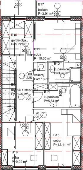 Kuća u nizu koja se sastoji od dnevnog boravka, blagovaonice, kuhinje, WC-a, terase, trijema, ulaznog prostora, spremišta i prostorije sa sustavom za grijanje u prizemlju te glavne spavaće sobe s vlastitom kupaonicom s tušem, dvije prostrane spavaće sobe, garderobne sobe, kupaonice s kadom, vešeraja, balkona i hodnika na katu.