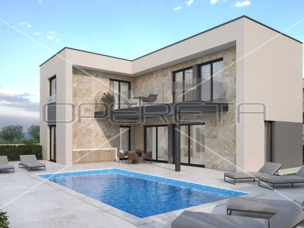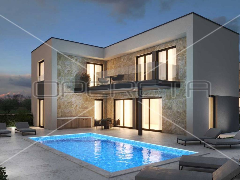 Istra, Peroj: A luxury villa for sale in Peroj, only 500 m from the sea, with the planned completion of construction in July 2025. The villa covers 200 m of living space and has two floors. On the ground floor and on the first floor there are four bedrooms, three bathrooms, two terraces and an outdoor pool of 32 m. There are two parking spaces in the courtyard of the villa, and the terrace offers a beautiful view of Brijune.