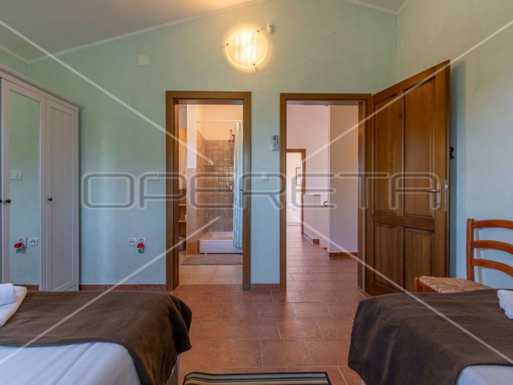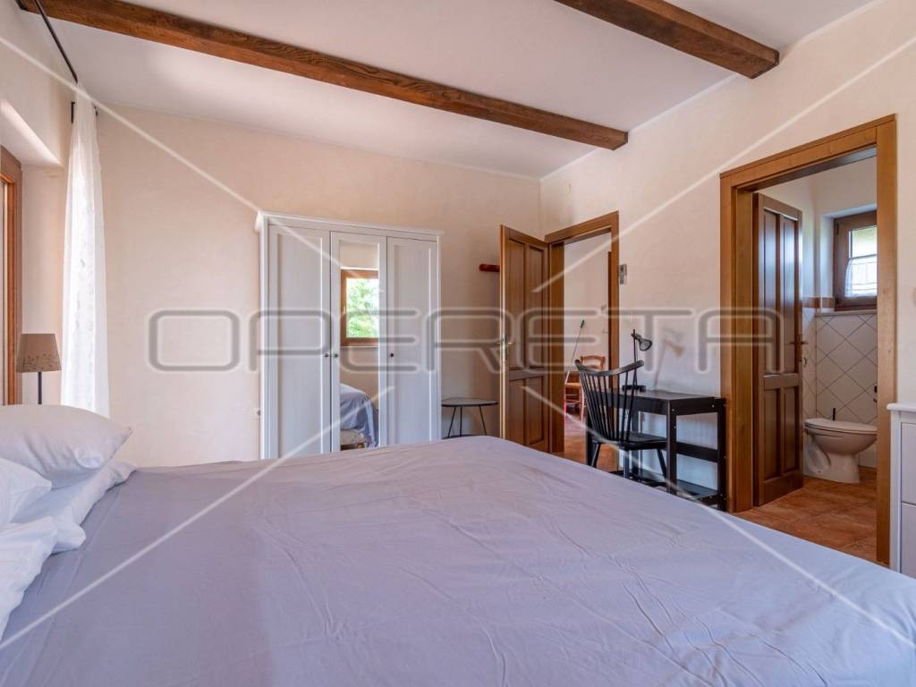 The staircase leads to the first floor where there are three bedrooms, each with its own bathroom. Two rooms are spacious and have access to the balcony from which you can go down the stairs directly to the garden.