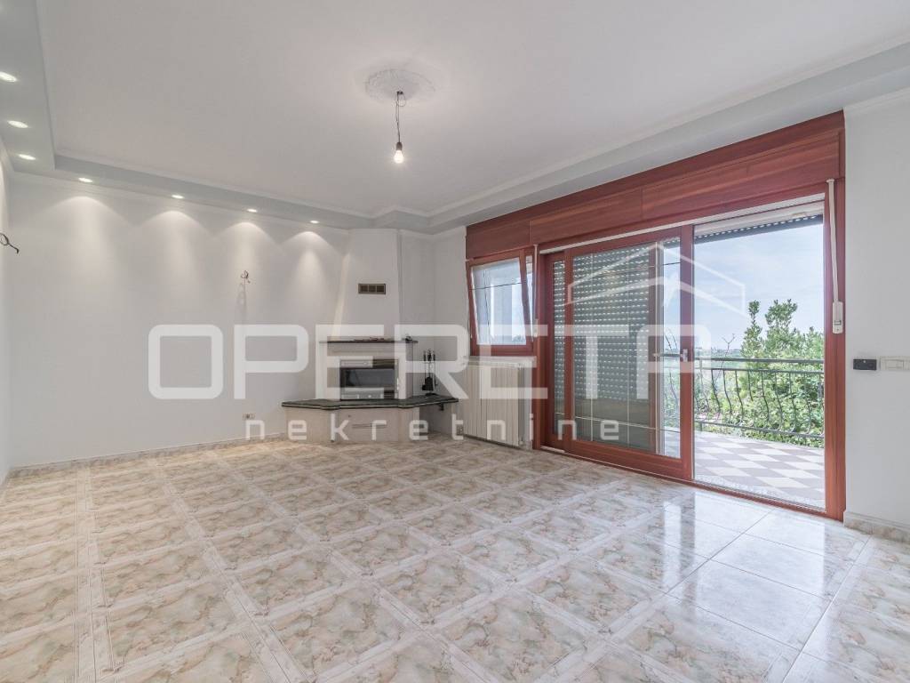 On the raised ground floor, there is a finished but unfurnished apartment comprising one bedroom, a kitchen with a dining area, a living room, and a bathroom.