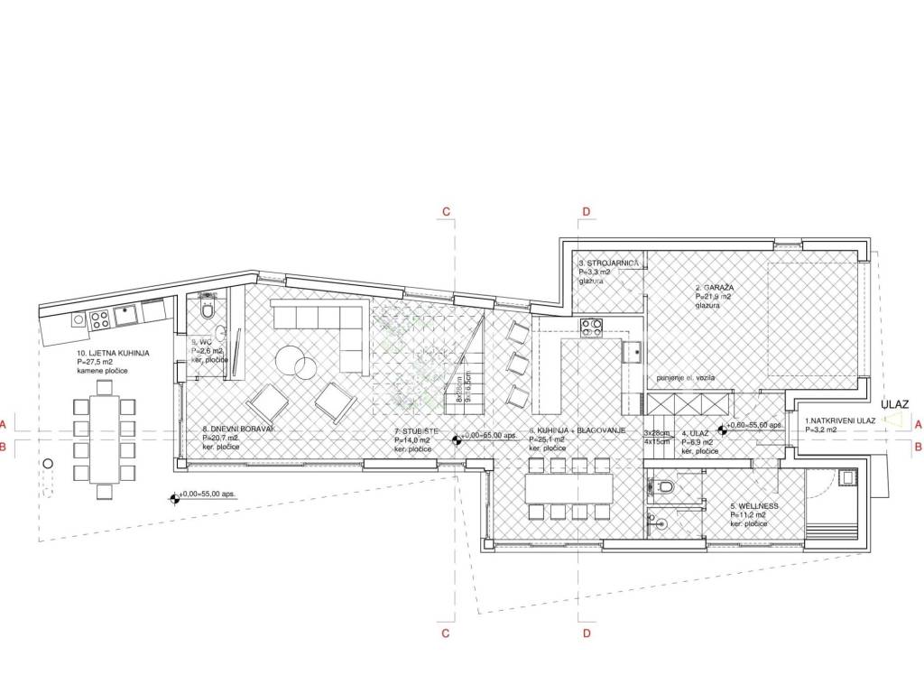On the ground floor there is a garage with a charging station for electric cars, a machine room, a wellness area, a toilet, a spacious kitchen with a dining room and a living room with access to a covered summer kitchen. Below is a heated concrete pool with a heat pump and a sunbathing area.