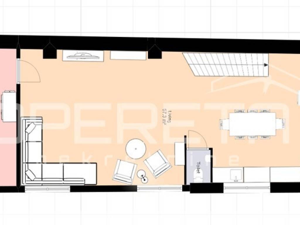 J-I-S orijentacije, s dva ulaza i funkcionalnog tlocrta prostire se na dvije etaže. U prizemlju se nalaze 2 spavaće sobe ( jedna sa walk-in ormarom), "master" spavaća soba povezana s kupaonicom i dodatnom radnom sobom ( koja ima i zaseban vanjski ulaz) te dodatna kupaonica. Nutarnje stubište povezuje ga s katom gdje se nalazi prostrani "open space" od 60 m2 koji uključuje modernu kuhinju, blagovaonicu i dnevni boravak s izlazom na veliku terasu okrenutu prema zelenilu, spavaća soba s garderobom, wc i hodnik.