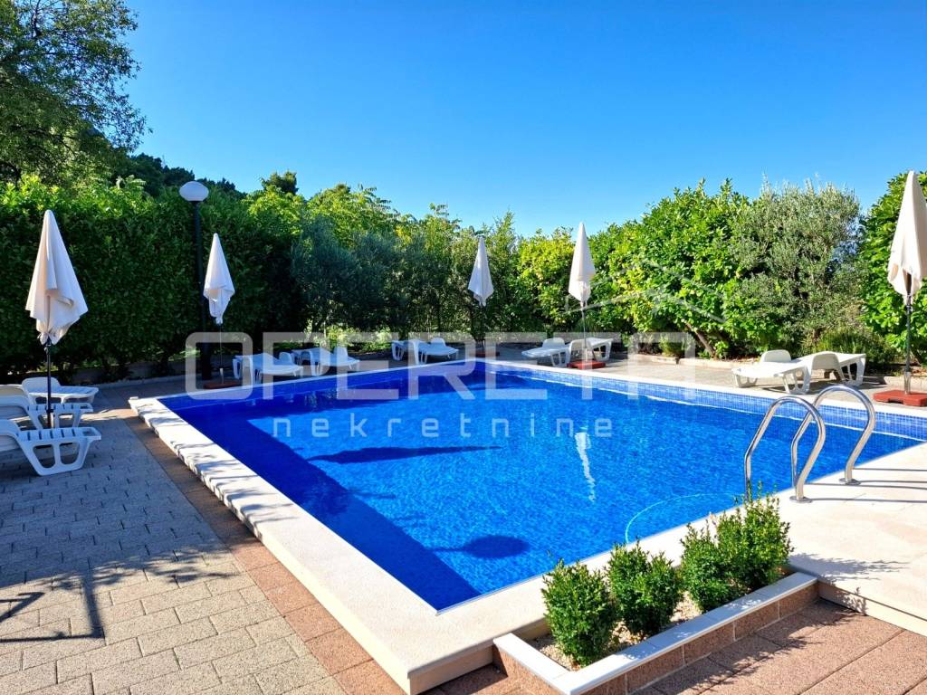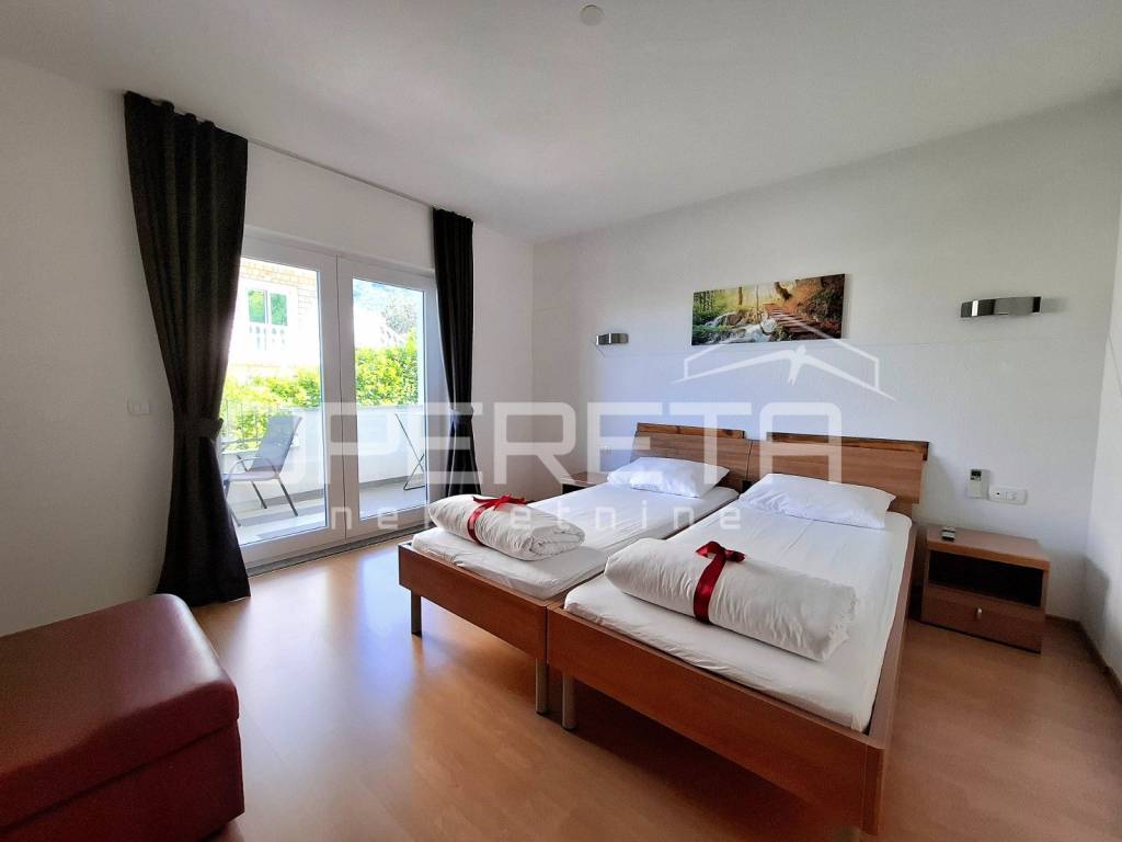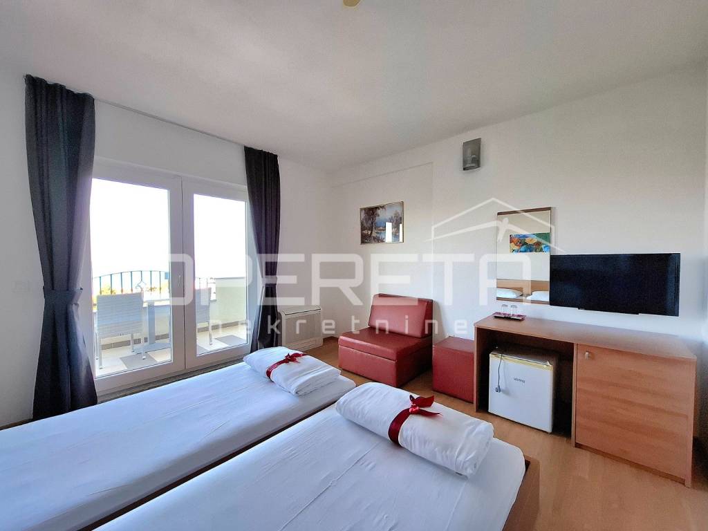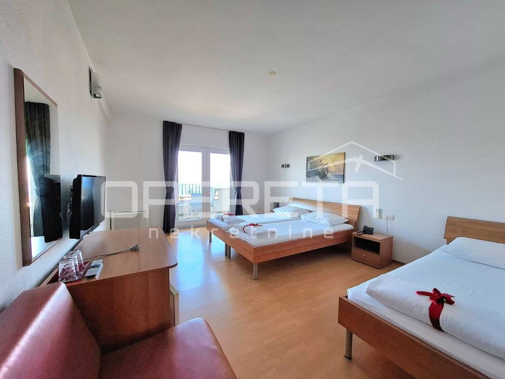 Ova nekretnina prostire se na parceli od gotovo 1800 m, dok sama zgrada hotela ukupno obuhvaća neto korisne površine više od 1500 m raspoređenih kroz suteren, prizemlje i tri kata. U sklopu hotela nalaze se 23 smještajne jedinice, uključujući dvokrevetne, trokrevetne i jednu obiteljsku sobu, od kojih svaka ima privatnu kupaonicu, balkon s pogledom na more i udoban, klimatiziran interijer.
