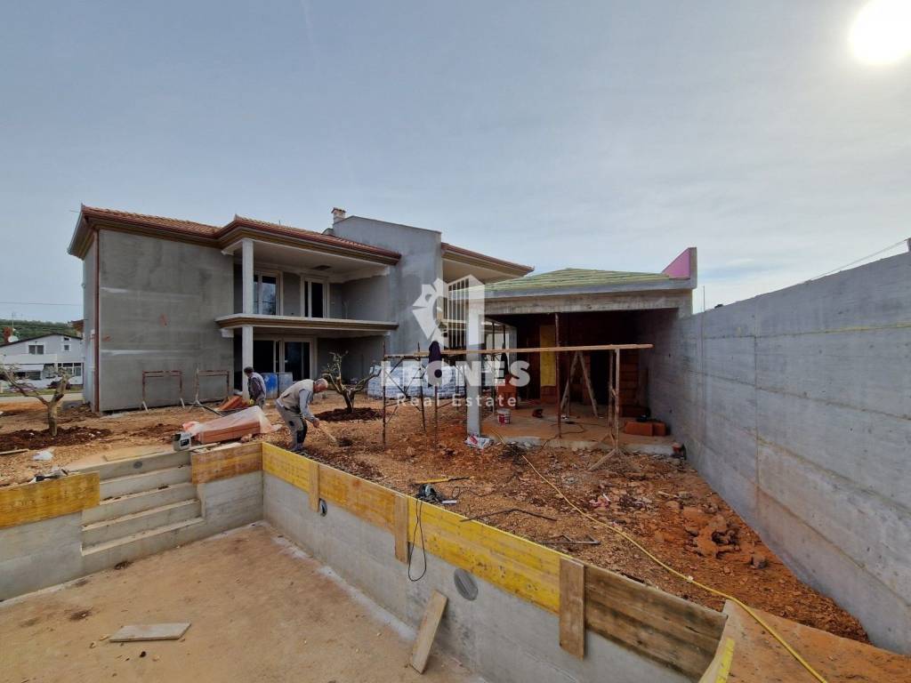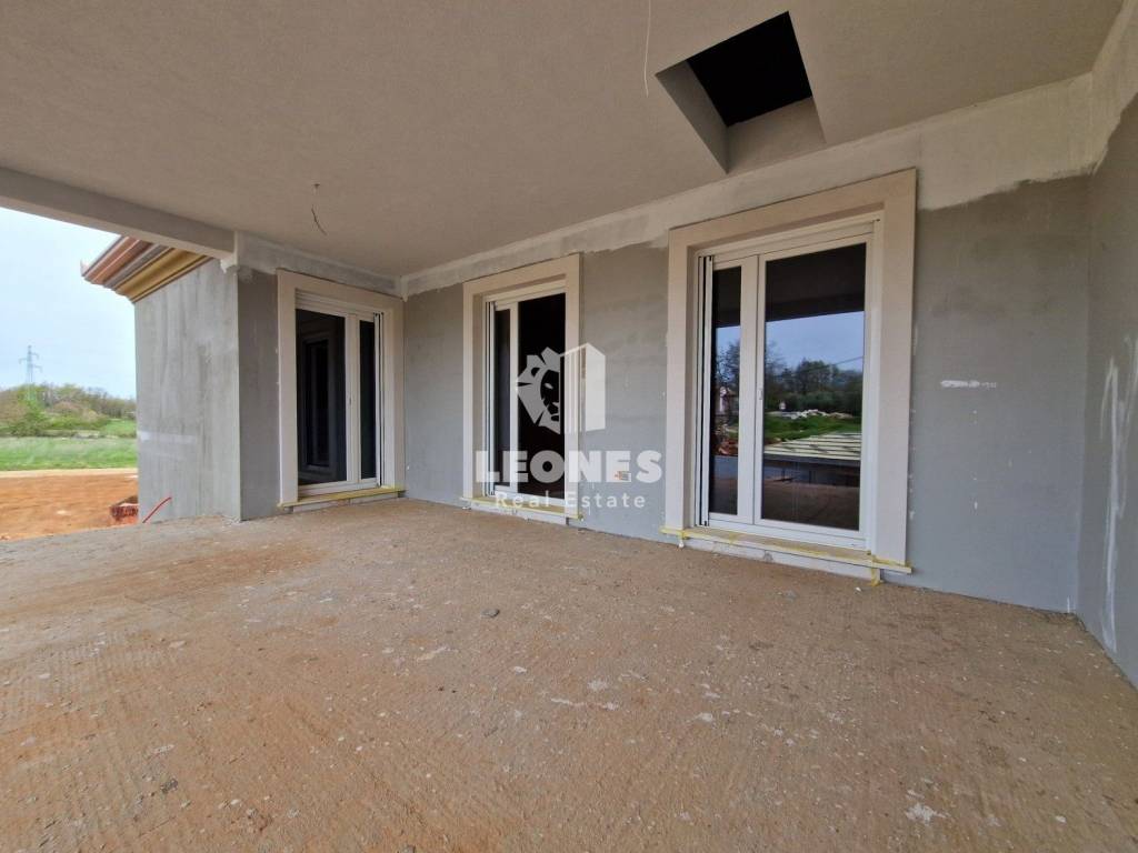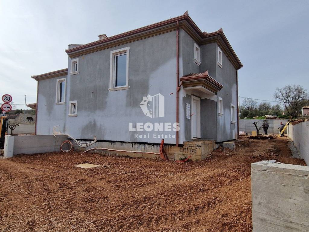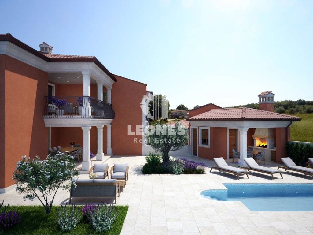 A charming house with a swimming pool in the vicinity of Momjan is for sale. The surface of the house is 173 m2 and extends over two floors. On the ground floor there is a living room, a kitchen and a dining room with access to a covered terrace, a bathroom, a storage room and a pantry. On the first floor there are 3 bedrooms, 2 bathrooms, a technical room and a large covered terrace of 26 m2. A 25 m2 swimming pool with a sun deck, an auxiliary facility of 25 m2 and 2 parking spaces are located on the 340 m2 garden.