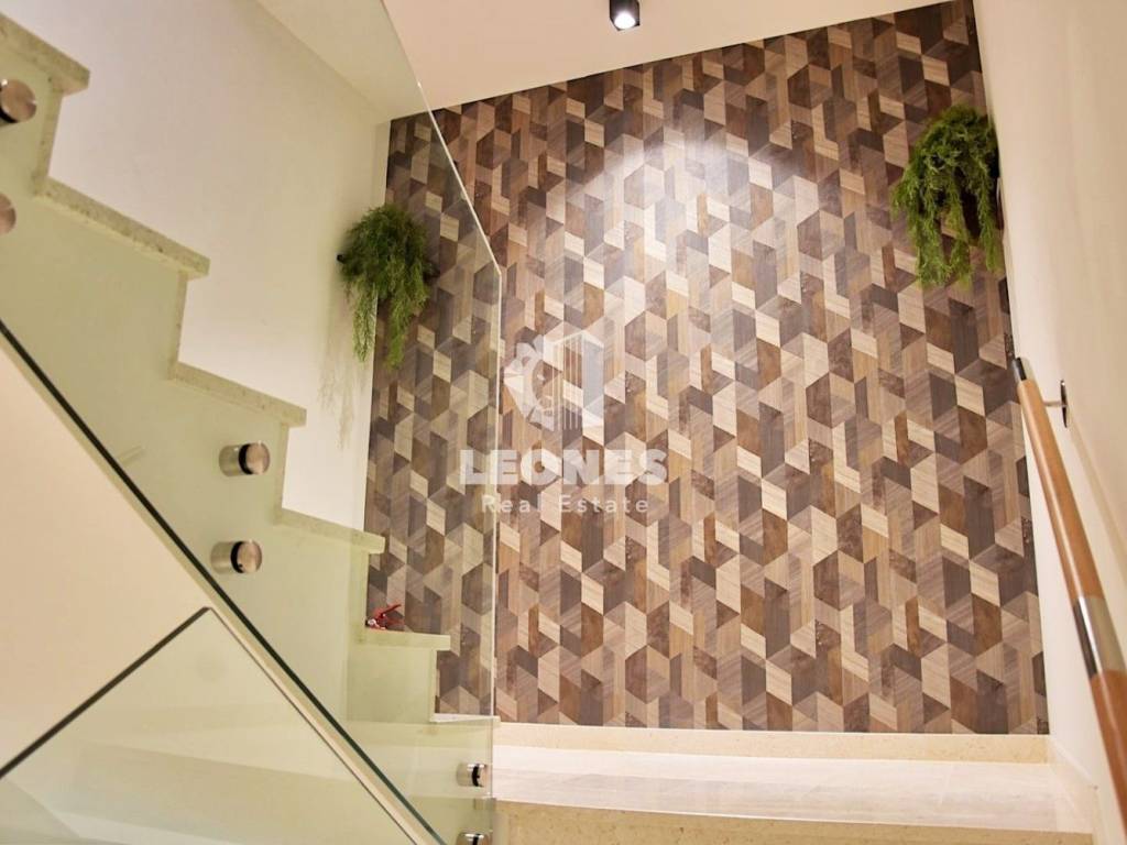 The staircase is covered with natural stone, as are the interior window sills. The entrance door is burglar-proof and fire-resistant. An intercom with a video camera is also installed.