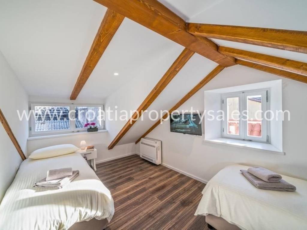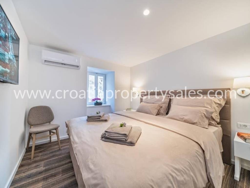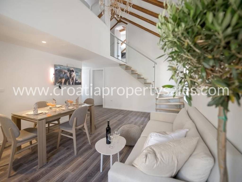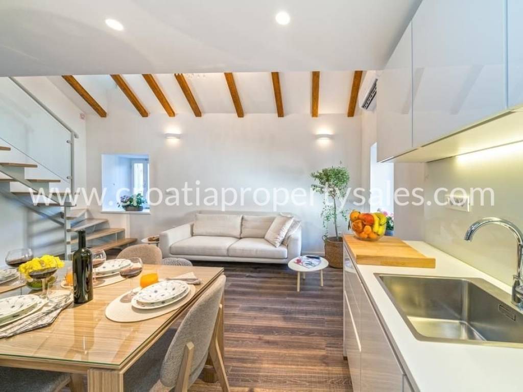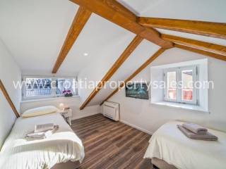 The apartment is located in the heart of Split, within the UNESCO-protected Diocletian's Palace. It has a total area of 70 m2 and is completely renovated and decorated in a modern style with preserved authentic elements such as wooden beams. The lower floor includes a living room, dining room, kitchen, one bedroom and a bathroom. The upper floor contains a second bedroom, a luxurious bathroom with a jacuzzi and a gallery view of the lower floor. The apartment is luxuriously furnished and ready to move in immediately. It is ideal for premium tourist rental.It is also possible to buy an apartment on the first floor.