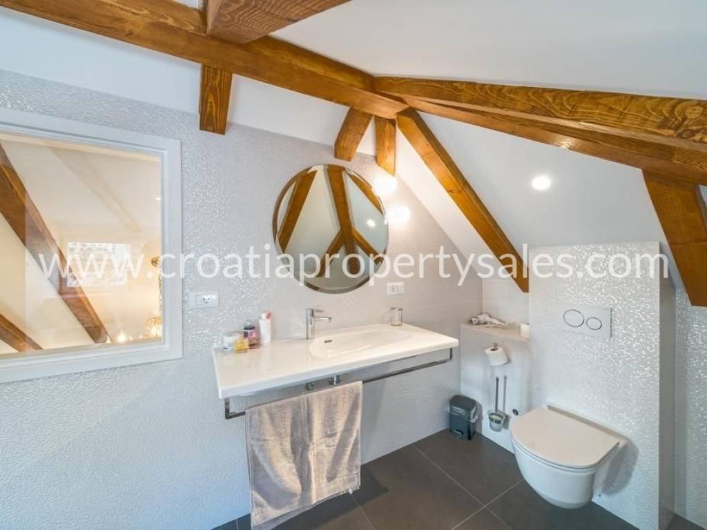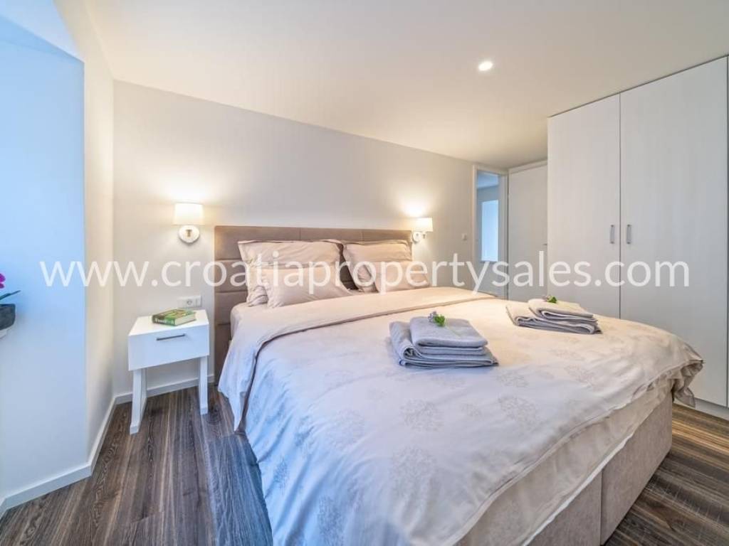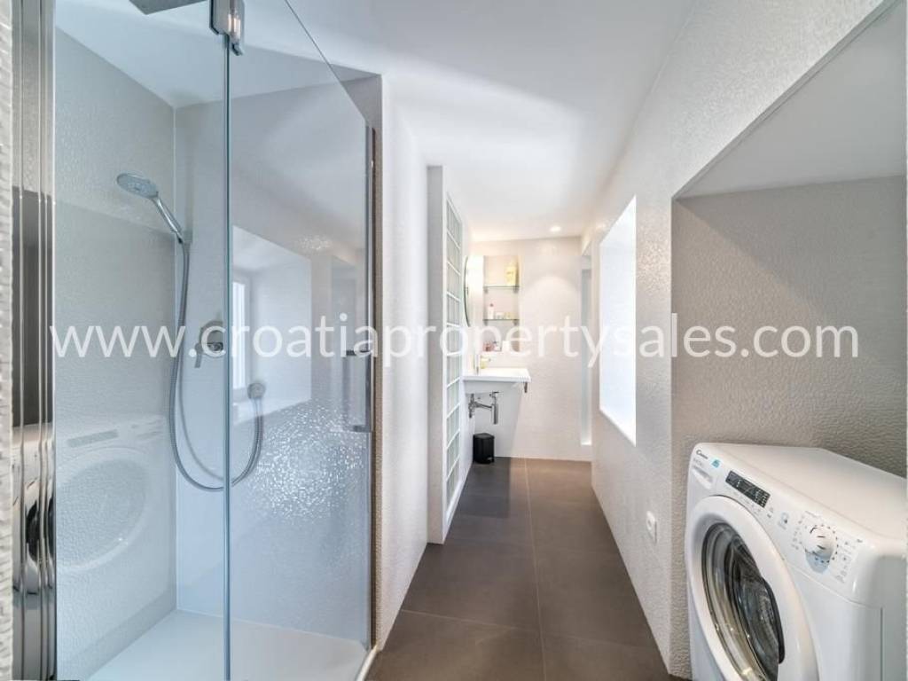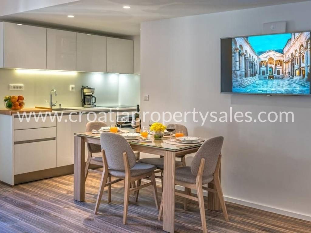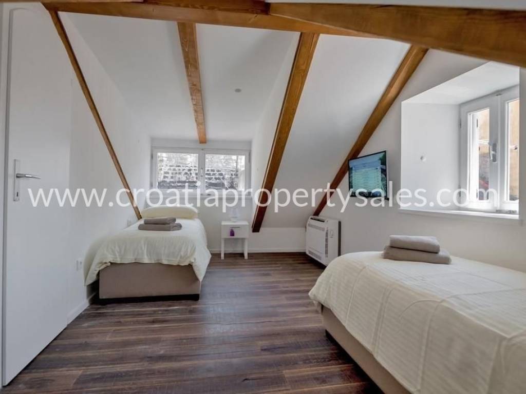 The apartment is located in the heart of Split, within the UNESCO-protected Diocletian's Palace. It has a total area of 70 m2 and is completely renovated and decorated in a modern style with preserved authentic elements such as wooden beams. The lower floor includes a living room, dining room, kitchen, one bedroom and a bathroom. The upper floor contains a second bedroom, a luxurious bathroom with a jacuzzi and a gallery view of the lower floor. The apartment is luxuriously furnished and ready to move in immediately. It is ideal for premium tourist rental.It is also possible to buy an apartment on the first floor.