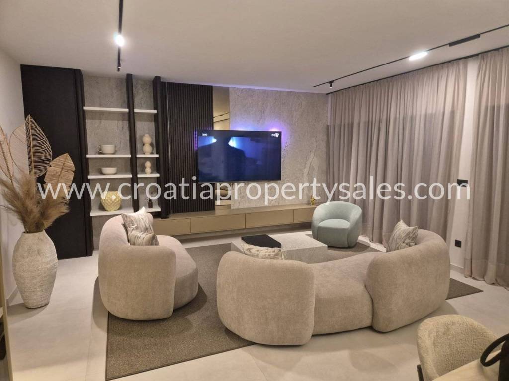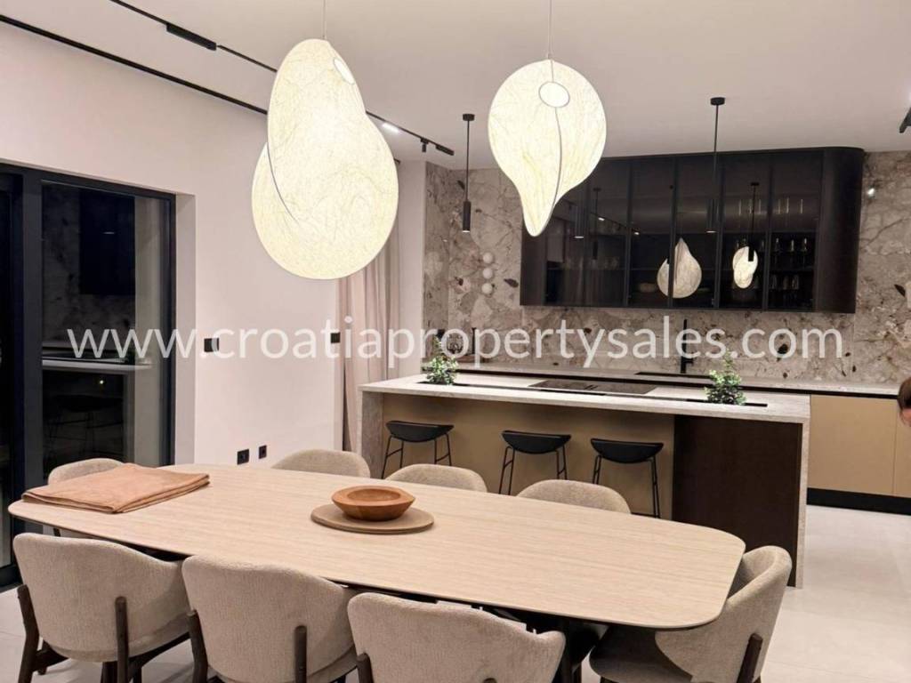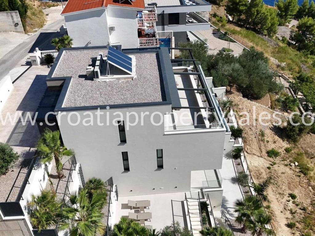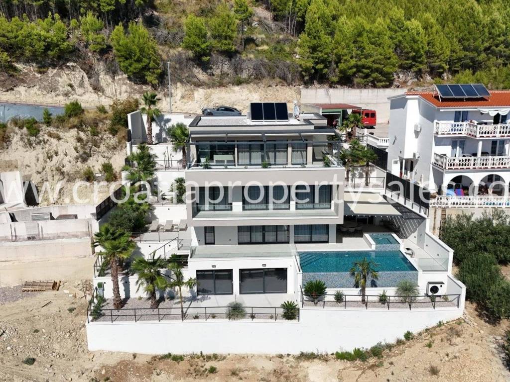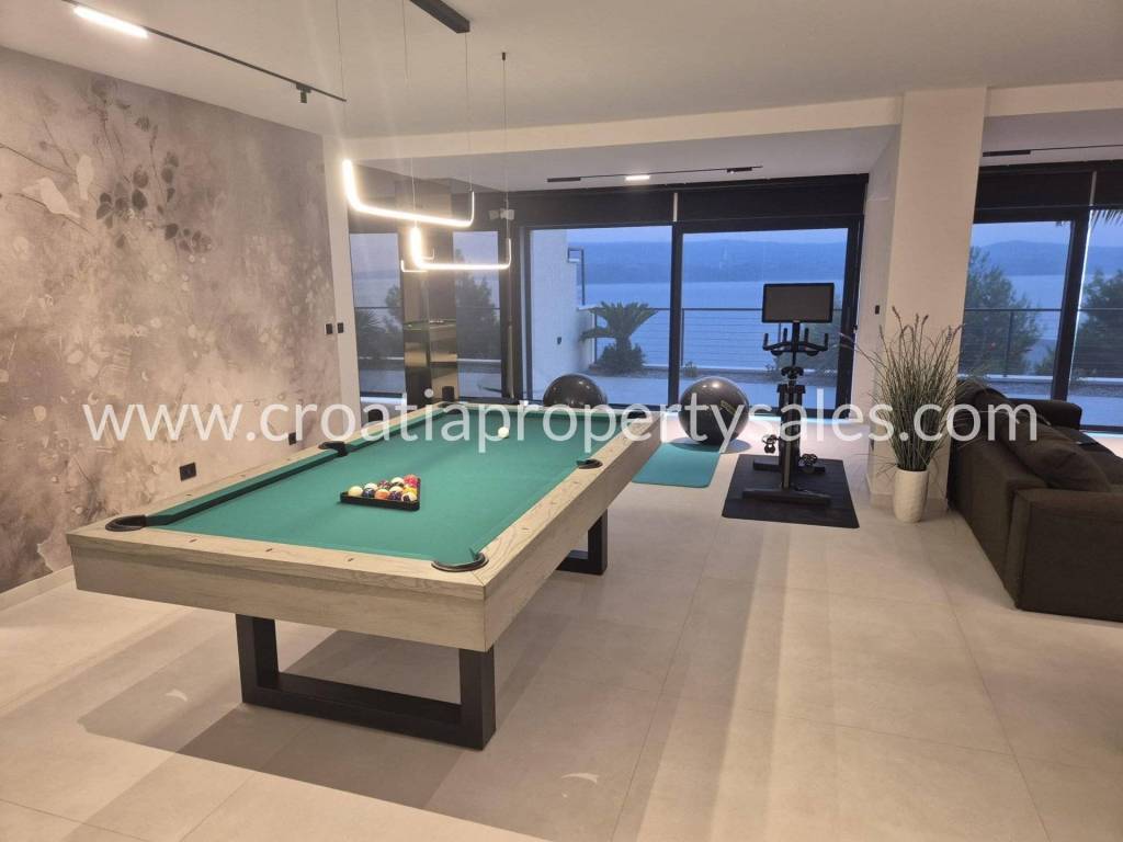 Luxury villa with swimming pool and wellness facilities. A modern luxury villa is for sale located in a quiet part of the Omiš Riviera, with panoramic sea views and top-notch amenities for relaxation and enjoyment. The basement of the villa is designed as a zone for relaxation and entertainment. It contains an area with pool equipment, sauna, fitness area with gym, space for socializing and entertainment with television and billiards. The ground floor is designed as an open-plan living area. There is a guest toilet, modern kitchen, dining room and spacious living room with access to the terrace and pool. The first floor is reserved for the family night zone with three comfortable bedrooms, each with its own bathroom, and on the same floor there is a storage room. The second floor offers complete privacy in the form of a master bedroom with its own bathroom and dressing room. Part of the floor on the outside belongs to the garage for 2 cars. The villa was built in a modern style with an emphasis on top quality materials and finishes. The panoramic view of the sea and the surrounding islands provides a special experience, while spacious terraces allow you to relax outdoors and enjoy the pleasant Mediterranean climate. The special value of this property is offered by the wellness and fitness facilities, which offer their users luxury and comfort without leaving home.