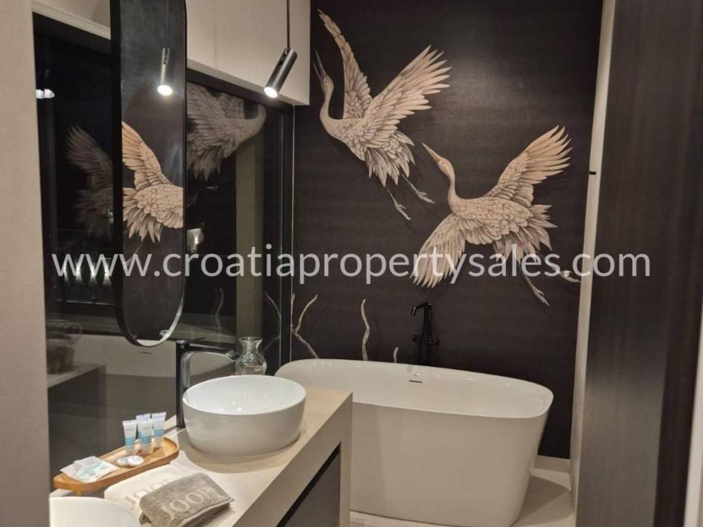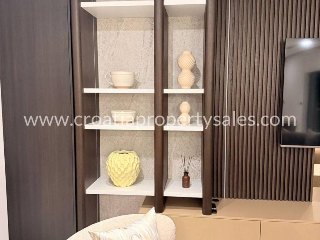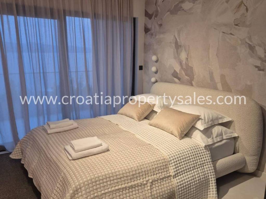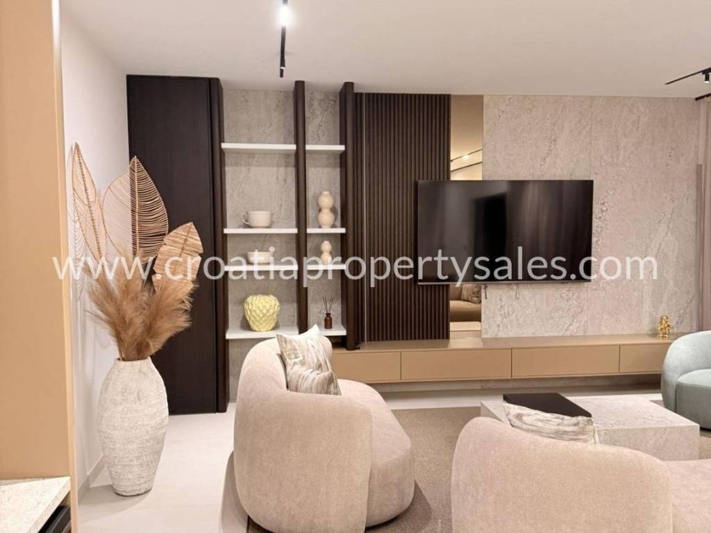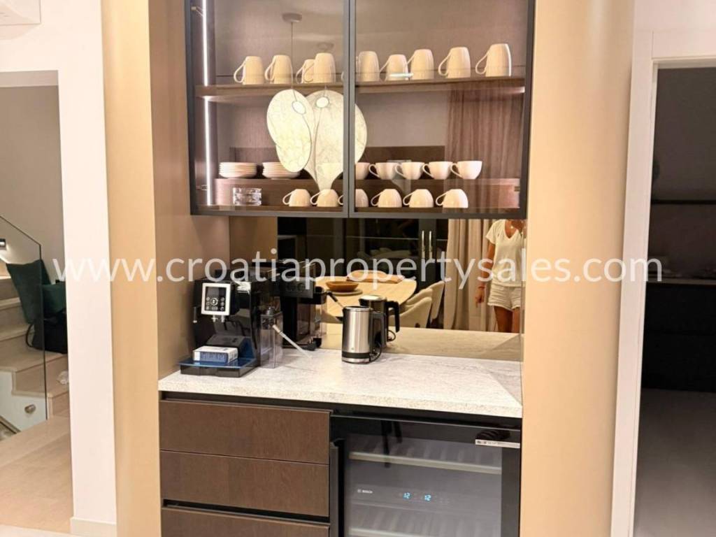 Luxury villa with swimming pool and wellness facilities. A modern luxury villa is for sale located in a quiet part of the Omiš Riviera, with panoramic sea views and top-notch amenities for relaxation and enjoyment. The basement of the villa is designed as a zone for relaxation and entertainment. It contains an area with pool equipment, sauna, fitness area with gym, space for socializing and entertainment with television and billiards. The ground floor is designed as an open-plan living area. There is a guest toilet, modern kitchen, dining room and spacious living room with access to the terrace and pool. The first floor is reserved for the family night zone with three comfortable bedrooms, each with its own bathroom, and on the same floor there is a storage room. The second floor offers complete privacy in the form of a master bedroom with its own bathroom and dressing room. Part of the floor on the outside belongs to the garage for 2 cars. The villa was built in a modern style with an emphasis on top quality materials and finishes. The panoramic view of the sea and the surrounding islands provides a special experience, while spacious terraces allow you to relax outdoors and enjoy the pleasant Mediterranean climate. The special value of this property is offered by the wellness and fitness facilities, which offer their users luxury and comfort without leaving home.