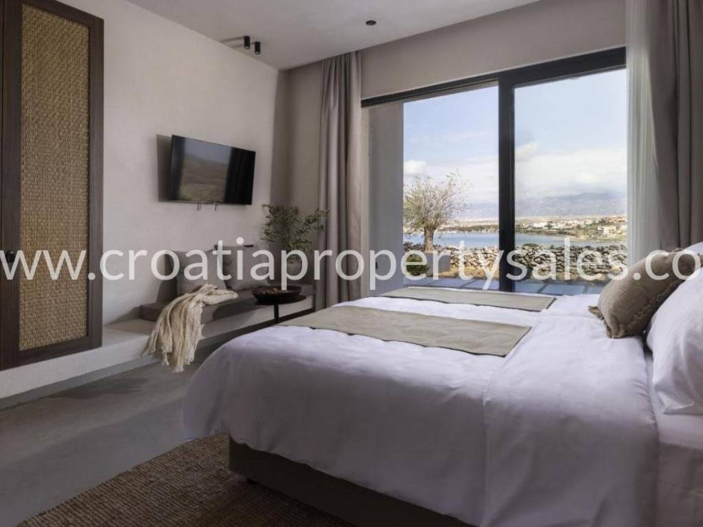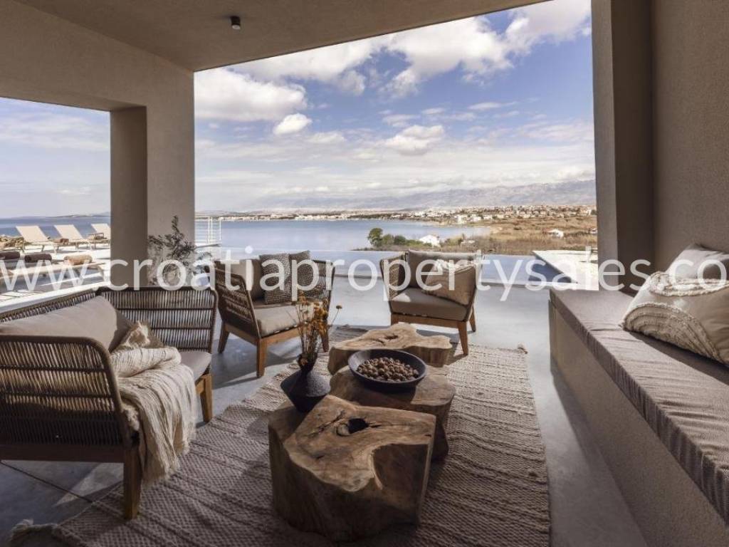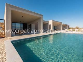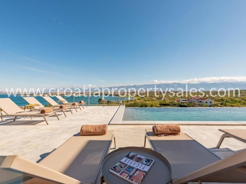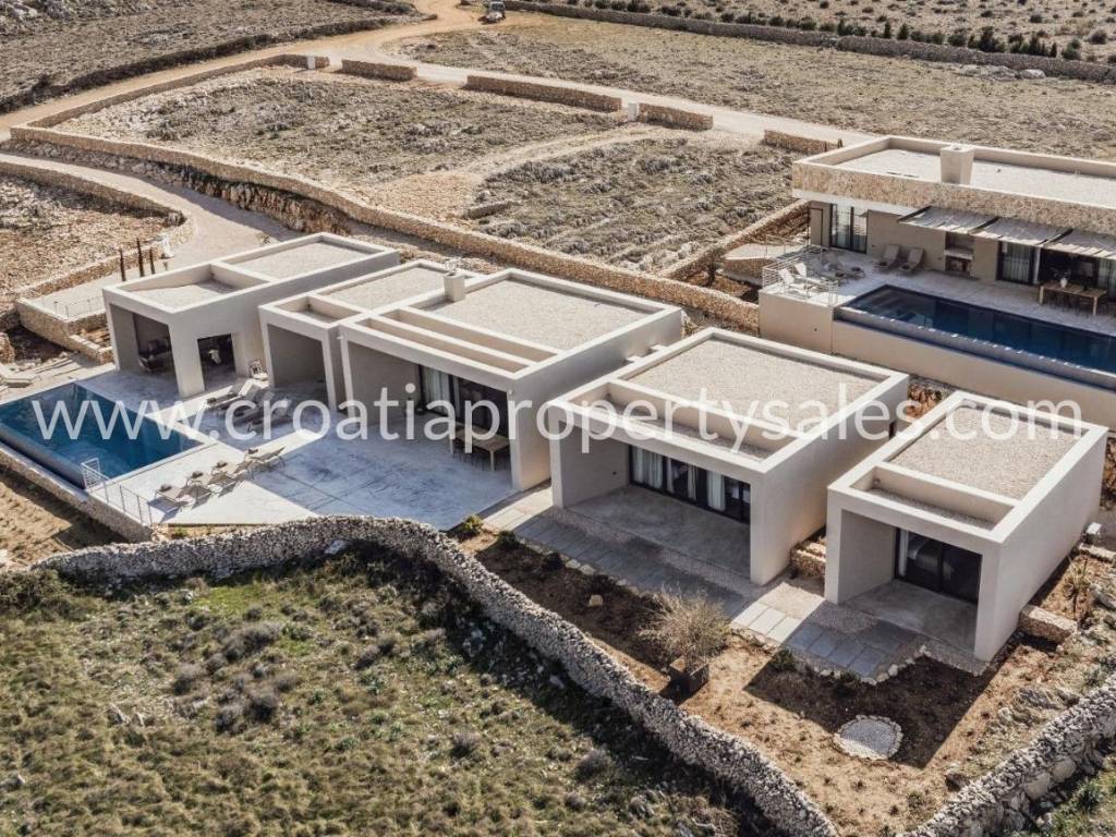 A truly unique property situated in a peaceful location in natural rocky surroundings on the island of Pag 150m from the beach. It comprises five units, two of which are separate and can be used as two studio apartments or two bedrooms. Three units are connected by an attractive glass corridor and consist of an open plan living area with a kitchen, storage room, and three comfortable en-suite bedrooms. All rooms offer access to a spacious terrace with a heated infinity pool (45m2), lounge area and BBQ. A great place to relax in tranquility yet close to the sea and beach. The highest quality materials were used in the construction and furnishing (Bosch appliances in the kitchen, Mitsubishi air conditioners, sanitary equipment Zucchetti and Galassia, Danfos underfloor heating in all rooms, STO facade insulation, ALU K aluminum carpentry). Zadar city centre is 50km away and Zadar airport is 60km away.