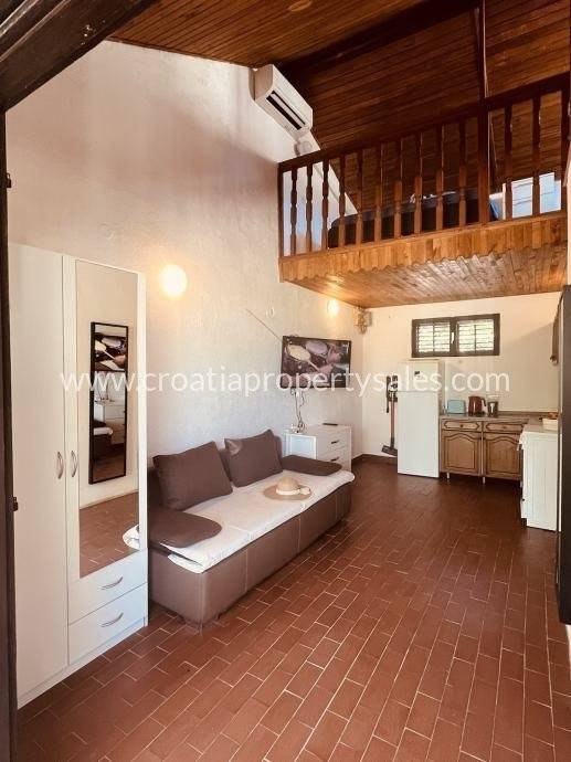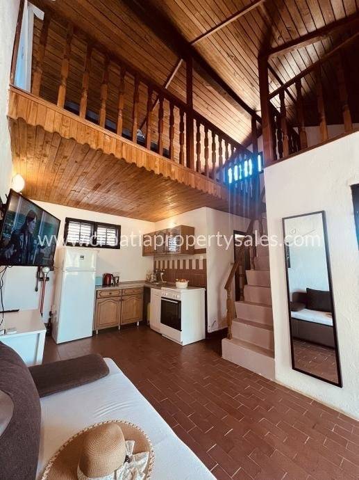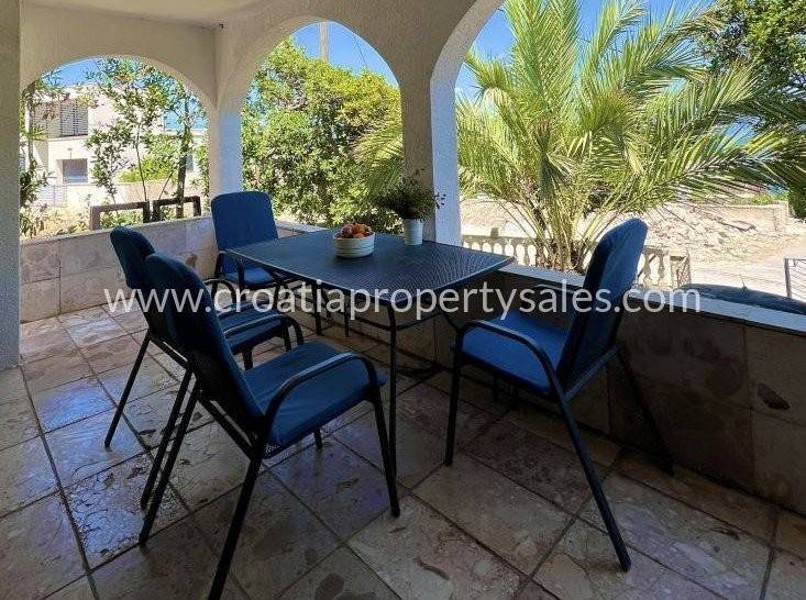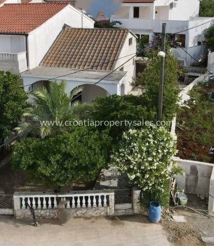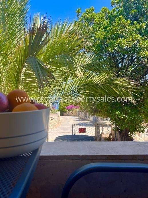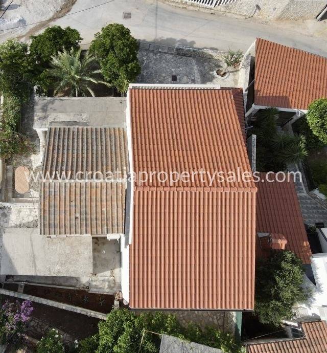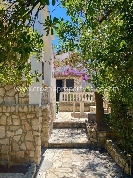 Semi-detached house only 50 m from the sea. It is located on a plot of 190 m2. The house has 2 bedrooms, bathroom, kitchen with dining room and living room. In front of the house there is a covered terrace for summer enjoyment in the shade. It is located only 50 m from the sea and approx. 600 m from the center of a small picturesque town. The house has a complete project for upgrading and renovating the building, all necessary documentation can be agreed upon with the purchase of the house.