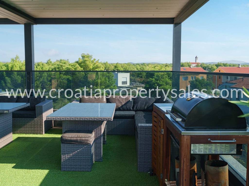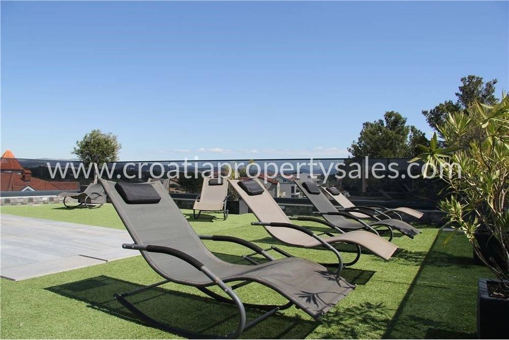 The roof terrace is 115m2 and consists of a bar with a pergola, electric awnings, swimming pool 2mx4m, deck chairs, outdoor corner furniture and barbecue.
